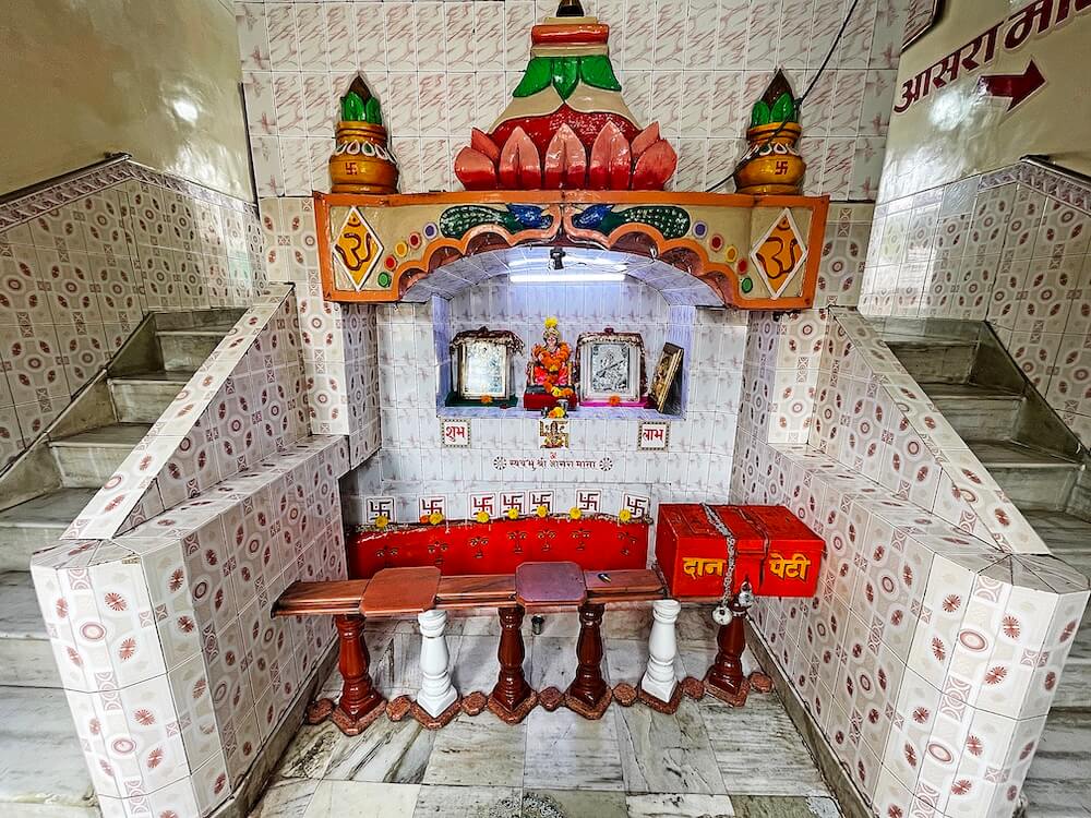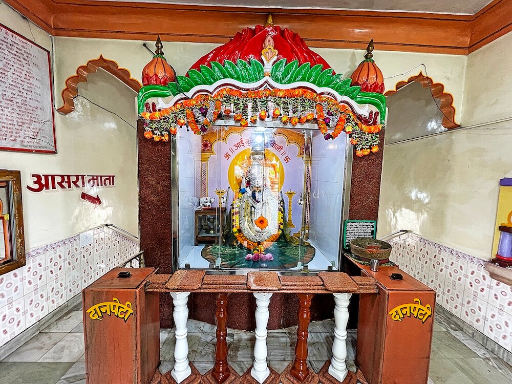 या गर्भगृहाच्या दोन्ही बाजूने जमिनीखाली असणाऱ्या आसरा मातेच्या स्थानाकडे जाण्यासाठी पायऱ्या आहेत. सहा ते सात पायऱ्या उतरून मूळ गर्भगृहाच्या खाली जमिनीत असणाऱ्या आसरा मातेच्या गर्भगृहात प्रवेश होतो. या गर्भगृहात स्वयंभू आसरा मातेचे स्थान आहे. येथील एका स्वयंभू शेंदूरचर्चित पाषाणावर देवीच्या सात प्रतिमा रंगविलेल्या आहेत. हा पाषाण आसरा माता म्हणून पुजला जातो. या पाषाणाच्या मागील भिंतीतील देवकोष्टकात देवीची मूर्ती आहे.