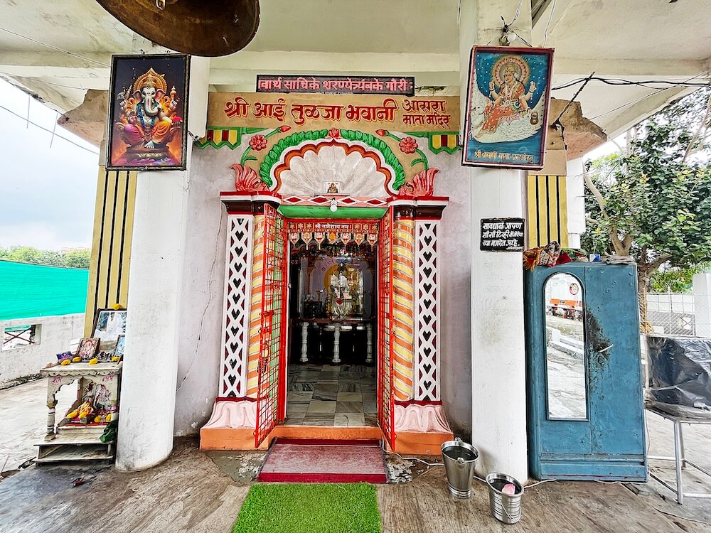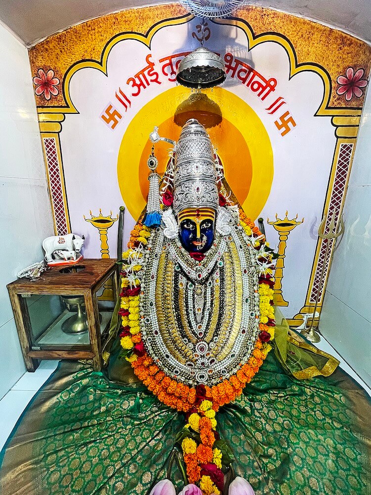मूळ मंदिरासमोर असलेल्या खुल्या सभामंडपाच्या प्रवेशद्वाराच्या दोन्ही बाजूंना सिंहशिल्पे आहेत. सभामंडपासमोरील एका चौथऱ्यावर कालभैरवाचे स्थान व येथून काही पावलांवरच देवीचे वाहन असलेल्या सिंहाचे शिल्प आहे. भाविकांच्या सुविधेसाठी या सभामंडपावर पत्र्याचे छप्पर आहे. येथील सभामंडपात मध्यभागी होमकुंड व बाजूने भाविकांसाठी आसने आहेत. सभामंडपाच्या पुढील बाजूस प्रदक्षिणा मार्ग सोडून गर्भगृह आहे. गर्भगृहाच्या प्रवेशद्वारावरील स्तंभशाखांवर नक्षीकाम आहे. गर्भगृहातील वज्रपिठावर तुळजाभवानी मातेची सुंदर मूर्ती विराजमान आहे. या वस्त्रालंकारित देवीच्या शिरावर चांदीचा मुकुट आहे. गर्भगृहातील देवकोष्टकांत गणपतीची मूर्ती, गजानन महाराजांची मूर्ती व तुळजाभवानीची प्रतिमा आहेत.