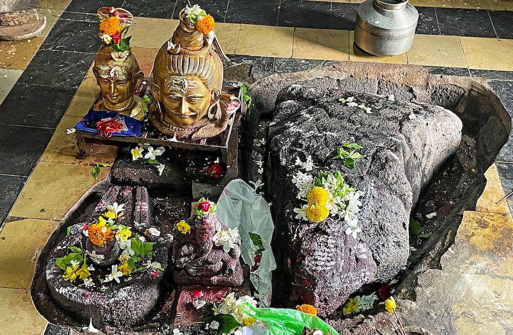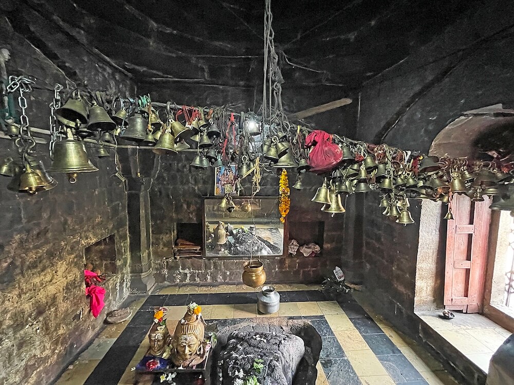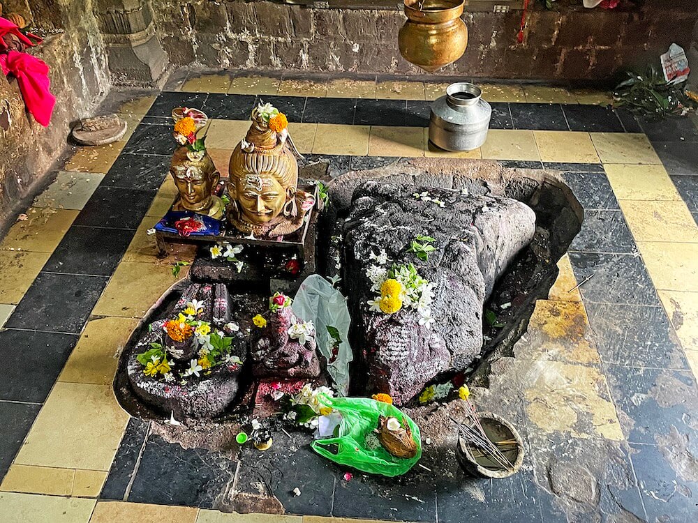 पुढे सभामंडपापेक्षा काही इंच उंच अर्धप्रदक्षिणा मार्ग व त्यापुढे हेमाडपंती स्थापत्यशैलीतील दगडी बांधकाम असलेले गर्भगृह आहे. प्रदक्षिणा मार्गावर गर्भगृहाच्या मागील दोन्ही बाजूस दरवाजे आहेत. पुढे गर्भगृहाचे प्रवेशद्वार आहे. प्रवेशद्वाराच्या दोन्ही बाजूला गर्भगृहाच्या भिंतीत दीपकोष्ठके आहेत. प्रवेशद्वारात दोन्ही बाजूस चौकोनी स्तंभ व वरील बाजूला महिरपी कमान आहे. स्तंभांना खालील बाजूस रिंगण नक्षी आहेत. गर्भगृहाच्या द्वारशाखा व ललाटपट्टीवर अस्पष्ट नक्षी आहेत. गर्भगृहात जमिनीवर मध्यभागी स्वयंभू शिवपिंडी व त्याभोवती नैसर्गिकरीत्या तयार झालेली शाळुंका आहे. शिवपिंडीवर जलधारा धरलेले पितळी अभिषेकपात्र छताला टांगलेले आहे. या शिवपिंडीचा आकार दिवसेंदिवस वाढत असल्याचे सांगितले जाते. शिवपिंडीच्या शेजारी महादेवाचा पितळी मुखवटा आहे. गर्भगृहाचे वितान अष्टकोनी व घुमटाकार आहे. छताला नवसाच्या पितळी घंटा टांगलेल्या आहेत. गर्भगृहाच्या बाह्य बाजूस सभोवती उंच अधिष्ठान आहे. सभामंडपाच्या छतावर चहूबाजूंनी बाशिंगी कठडा व गर्भगृहाच्या छतावर चारही कोनांवर नंदी शिल्पे आहेत. गर्भगृहावर मध्यभागी पाच थरांचे गोलाकार शिखर आहे. शिखराच्या प्रत्येक थरात बारा देवकोष्ठके व त्यात देवप्रतिमा आहेत. शिखराच्या शीर्षभागी आमलक व कळस आहे.