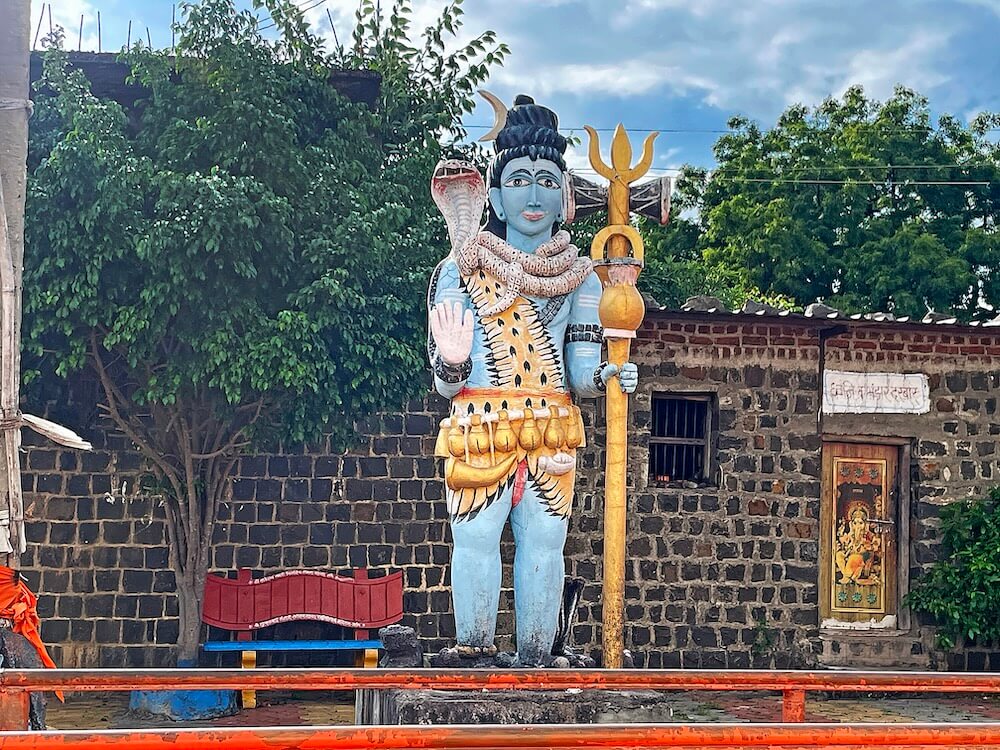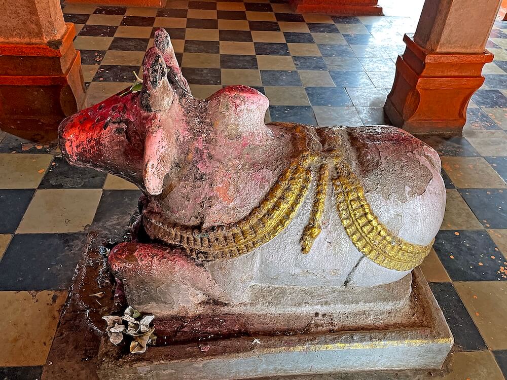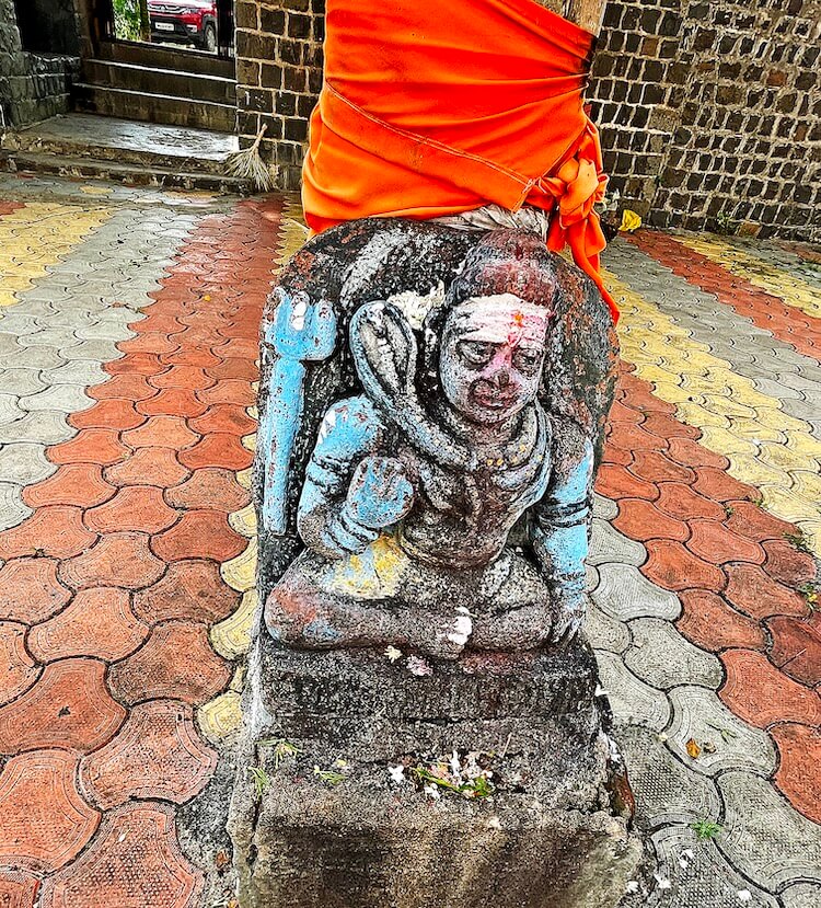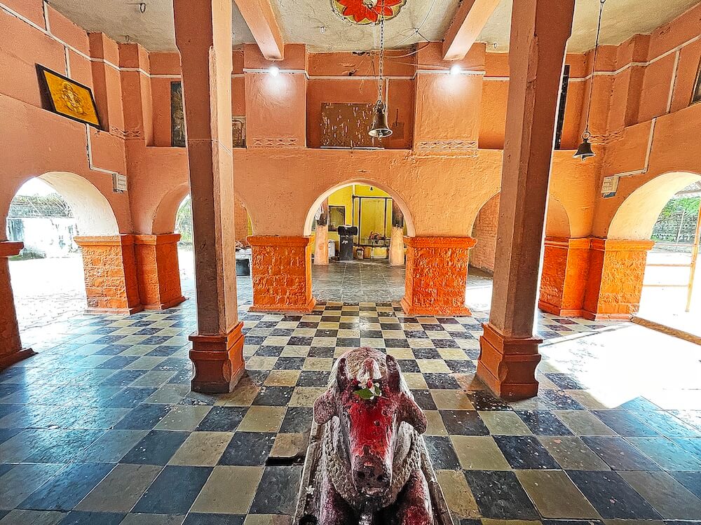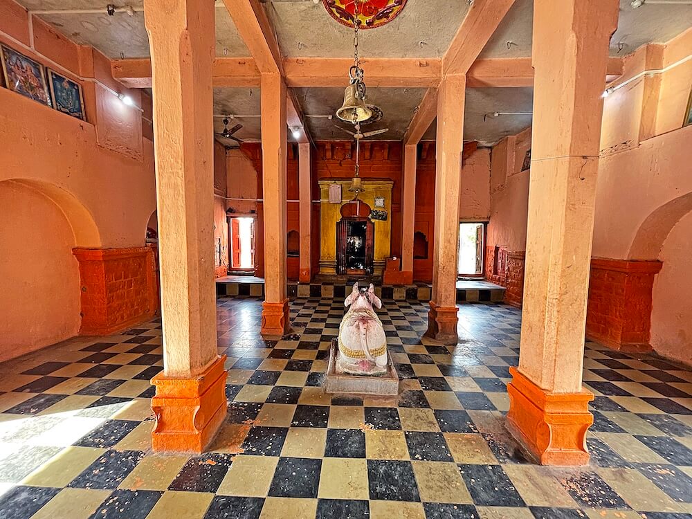 मंदिराचे प्रांगण पेव्हर ब्लॉक आच्छादित आहे. प्रांगणात चहूबाजूंनी तटबंदीला लागून अनेक प्राचीन वास्तू आहेत. यात धर्मशाळा, मंदिराचे भांडारकक्ष व पुजाऱ्यांची निवासस्थाने यांचा समावेश आहे. प्रांगणात भाविकांना बसण्यासाठी आसनांची व्यवस्था आहे. प्रांगणात मध्यभागी एका चौथऱ्यावर महादेवाची सुमारे पाच फूट उंचीची उभी मूर्ती आहे. महादेवाच्या एका हातात त्रिशूळ व त्याला जोडलेले कमंडलू आणि दुसरा हात आशीर्वाद मुद्रेत आहे. मूर्तीच्या शेजारी शिवपिंडी आहे. या मूर्तीच्या शेजारी महादेवाची बसलेल्या स्थितीतील आणखी एक मूर्ती आहे. प्रांगणात लोखंडी बॅरिकेड्स लावून दर्शनरांगेचे व्यवस्थापन केले आहे. प्रांगणात दोन उंच दगडी दीपस्तंभ आहेत. सभामंडप व गर्भगृह अशी मूळ रचना असलेल्या मंदिराचा काही वर्षांपूर्वी जीर्णोद्धार झाला आहे. मूळ सभामंडपाला जोडून बंदिस्त सभागृह बांधले असल्याने समोरील बाजूने असलेले मूळ प्रवेशद्वार आतील बाजूला गेले आहे. त्यामुळे सभामंडपाच्या डाव्या व उजव्या बाजूला असलेल्या दरवाजांतून सभामंडपात प्रवेश करता येतो. या सभामंडपात चार दगडी स्तंभ व त्यावर तीन अर्धचंद्राकार कमानी आहेत. हा मूळ खुल्या स्वरूपाचा सभामंडप नंतरच्या काळात भिंती बांधून बंदिस्त केल्याचे दिसून येते. बंदिस्त सभामंडपात हवा येण्यासाठी गवाक्षे आहेत. सभामंडपात मध्यभागी प्रत्येकी चार स्तंभांच्या दोन रांगा आहेत. हे स्तंभ सुमारे दीड फूट उंच पाषाणी स्तंभपादावर उभे असून स्तंभांवर तुळई व तुळईवर छत आहे. छताला पितळी घंटा टांगलेल्या आहेत. वितानावर चक्राकार नक्षी आहेत. सभामंडपाच्या जमिनीवर मध्यभागी असलेल्या चौथऱ्यावर नंदीची मूर्ती आहे.