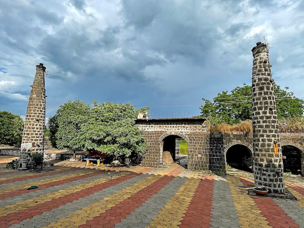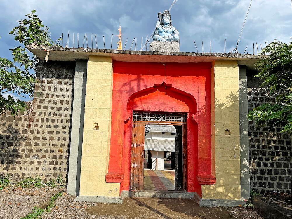 मुख्य रस्त्यापासून मंदिराकडे जाणाऱ्या रस्त्यावर पहिली स्वागतकमान आहे. दोन्ही बाजूला गोलाकार स्तंभ, त्यावरील तुळईवर महिरपी कमान आणि वरील देवकोष्ठकात महादेवाची ध्यानस्थ मूर्ती, असे या स्वागत कमानीचे स्वरूप आहे. मंदिरास भक्कम दगडी तटबंदी व तटबंदीत मोठे प्रवेशद्वार आहे. या प्रवेशद्वाराची पुनर्बांधणी केली असल्याने यात नव्या-जुन्याचा सुंदर संगम दिसून येतो. प्रवेशद्वाराच्या दोन्ही बाजूस असलेल्या दोन नक्षीदार चौकोनी स्तंभांमध्ये दीपकोष्ठके व खालील दोन्ही बाजूस पहारेकऱ्यांची आसने आहेत. द्वारशाखा व ललाटपट्टीवर पानाफुलांच्या अस्पष्ट नक्षी आहेत. प्रवेशद्वारावर महिरपी कमान व आतील बाजूला पहारेकरी कक्ष आहेत. प्रवेशद्वाराच्या मागील बाजूने तटबंदीवर जाण्यासाठी जिना आहे. प्रवेशद्वाराच्या छतावर मध्यभागी वज्रपीठावर महादेवाची ध्यानस्थ मूर्ती आहे.
