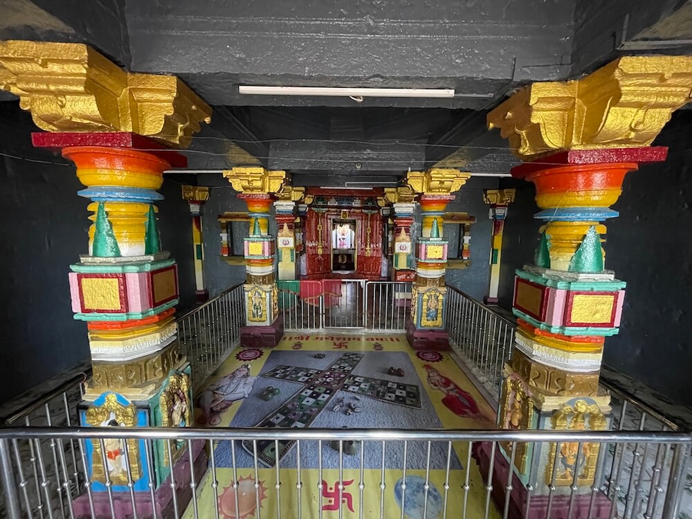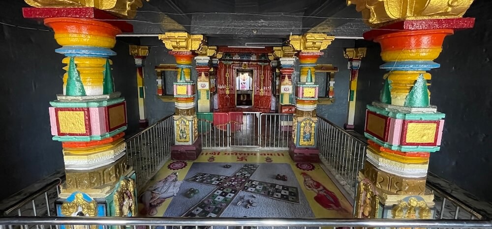 या चार स्तंभांनी केलेल्या चौकामध्ये मोठा चौसर वा सारीपाट मांडलेला आहे. प्राचीन भारतात दोन बैठ्या खेळांचा उद्गम झाला होता. त्यातील एक चतुरंग म्हणजे शतरंज वा बुद्धिबळ होय. यावर आचार्य शूलपाणी यांचा ‘चतुरंगदीपिका’ नामक संस्कृत ग्रंथ आहे; तर दुसरा चौसर. तो म्हणजे आजच्या ‘ल्युडो’सारखा खेळ होय. पारंपरिक दृष्टीने भारतात शंकराला द्यूताचा प्रवर्तक मानले जाते. वेरुळच्या एका गुंफेत भगवान शंकर व पार्वती चौसर म्हणजे सारीपाट खेळत असल्याचे शिल्प कोरलेले आहे. येथेही शंकर-पार्वतीचा चौसरचा खेळ रंगला होता, अशी आख्यायिका आहे. त्याची स्मृती म्हणून येथे हा पट मांडलेला आहे.
