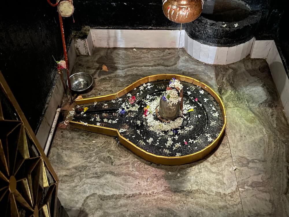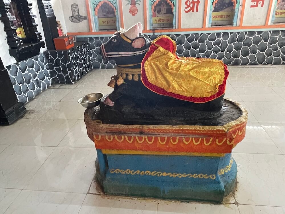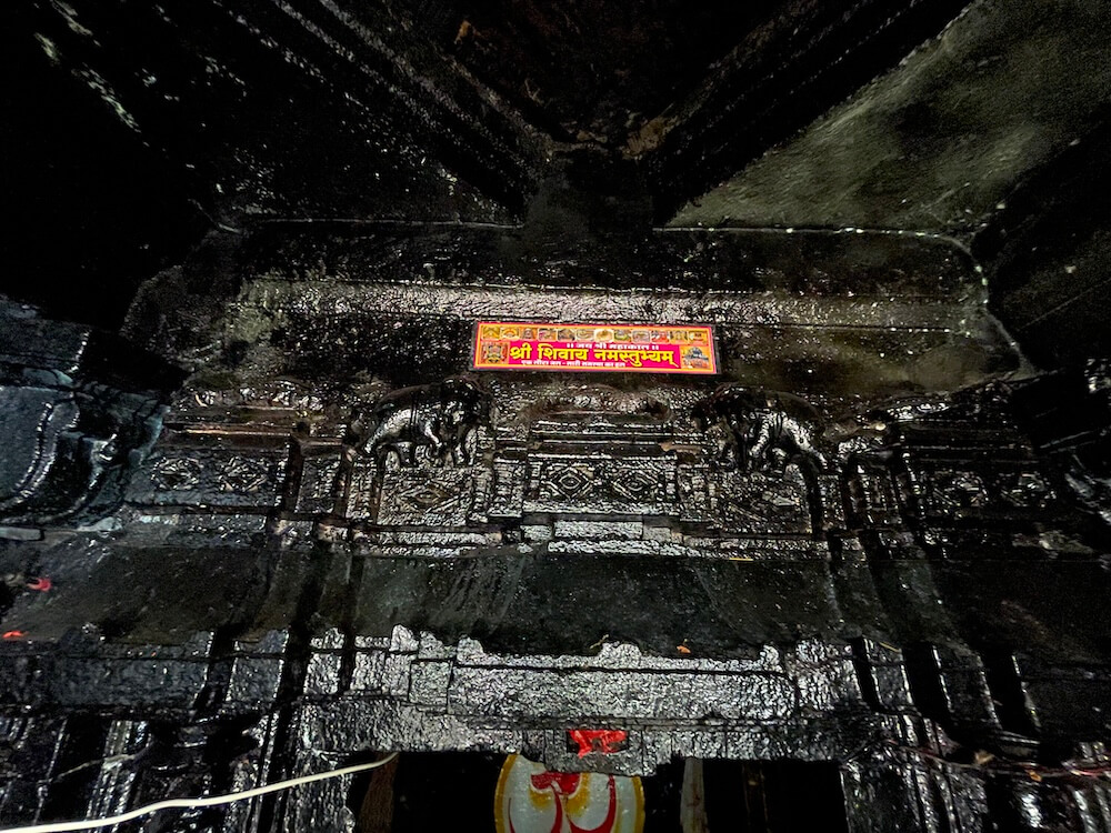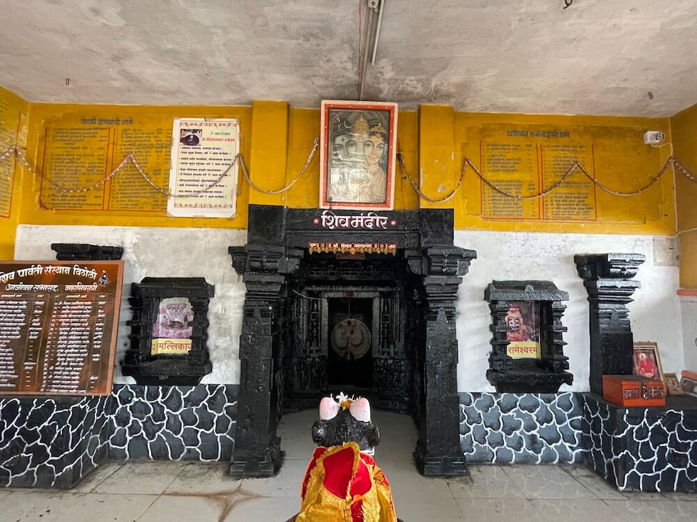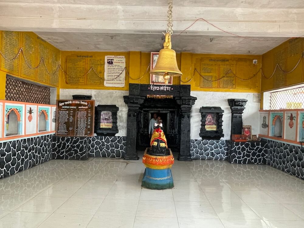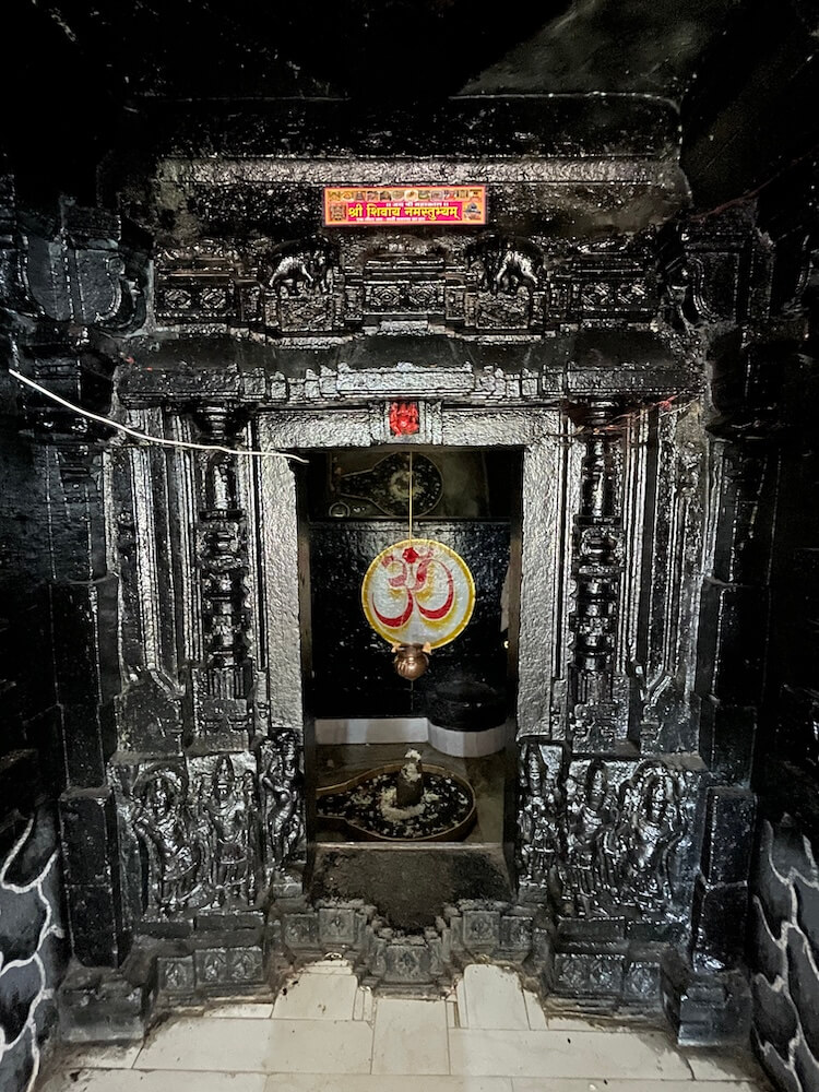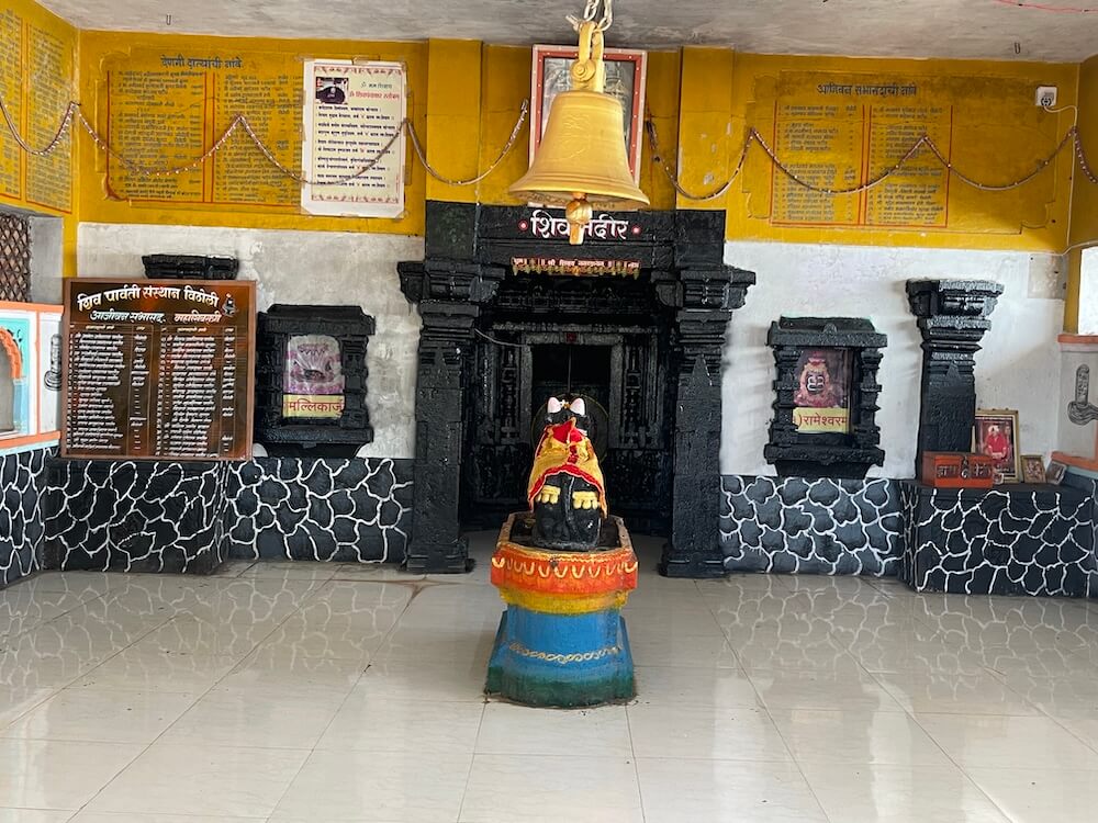सभामंडपात मध्यभागी उंच दगडी चौथऱ्यावर नंदीची दगडी मूर्ती विराजमान आहे. सभामंडपाच्या भिंतींमधील देवळ्यांमध्ये बारा ज्योतिर्लिंगांच्या प्रतिमा लावलेल्या आहेत. येथून मूळ मंदिरवास्तूस प्रारंभ होतो. अंतराळ आणि गर्भगृह अशी सध्याच्या मूळ मंदिराची रचना आहे. अंतराळाच्या प्रवेशद्वारस्थानी दोन मोठे चौकोनाकार स्तंभ आहेत. हे स्तंभ, तसेच त्यावरील पाषाणाची तुळई ही नक्षीकामविरहित आहे. गर्भगृहाचे प्रवेशद्वार मात्र सुंदर कोरीवकामाने सुशोभित आहे. या त्रिशाखीय प्रवेशद्वाराची आतील व बाहेरील द्वारशाखा सपाट आहे. मध्ये स्तंभशाखा आहे. द्वारशाखांच्या खालच्या बाजूस गंगा, यमुना व द्वारपाल यांची त्रिभंग शिल्पे आहेत. मंडारक चौकोनाकाराने तयार केलेला आहे. द्वारचौकटीच्या ललाटबिंबस्थानी गणेशाची छोटी मूर्ती आहे. उतरांग भागात दोन लक्षणीय गजशिल्पे आहेत. गर्भगृहाचा आकार छोटेखानी आहे आणि त्यात भूतलावर पूर्वाभिमुख शिवपिंडी आहे. काळ्या दगडातील प्राचीन अशा शिवपिंडीवर मोठे अभिषेकपात्र आहे. गर्भगृहाच्या छताकडील भाग चौकोनी आकाराचा आहे. गाभाऱ्यातील मागच्या भिंतीमध्ये दगडाचे एक कोरीव गोलाकार पात्र आहे.