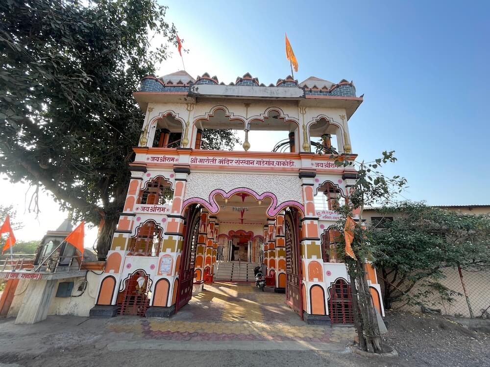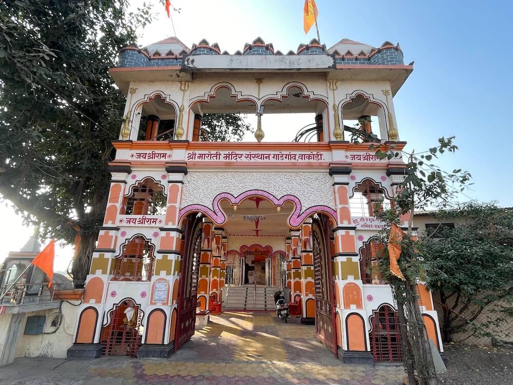 या परिसराला जुने गाडेगाव म्हणूनही ओळखले जाते. १८व्या शतकात नळगंगा नदीला मोठा पूर आला होता. या पुराच्या पाण्यात तीन मूर्ती वाहून आल्या होत्या. त्यापैकी हनुमानाच्या मूर्तीची येथे विधिवत प्रतिष्ठापना करण्यात आली. गावातील राजाराम ताराचंद चौहान यांच्या शेतात हे मंदिर उभारण्यात आले आहे. काही वर्षांपूर्वी येथे काशी विश्वेश्वराच्या शिवलिंगाचीही प्रतिष्ठापना करण्यात आली. अलीकडेच या मंदिराचा जीर्णोद्धार करण्यात आला. त्यानंतर या मंदिराला सध्याचे स्वरूप आले आहे. या मंदिरासमोर दुमजली प्रवेशद्वार आहे. या प्रवेशद्वाराच्या वरच्या मजल्यावर नगारखान्याची रचना आहे. प्रवेशद्वाराच्या डाव्या बाजूस असलेल्या छोट्या चौथऱ्यावरील देवळीवजा मंदिरात शेगावच्या गजानन महाराजांची मूर्ती आहे. प्रवेशद्वारातून आत आल्यावर मंदिराच्या प्रांगणात प्रवेश होतो. या प्रांगणात वटवृक्षासह काही झाडे आहेत. मंदिराच्या आवारभिंतीजवळ भाविकांना बसण्यासाठी आसनव्यवस्था आहे. मंदिरासमोर अर्धखुल्या स्वरूपाचा मंडप आहे. त्यापुढे उंच अधिष्ठानावर मंदिर आहे. सभामंडप आणि मध्यभागी गर्भगृह अशी या मंदिराची रचना आहे. मंडपातून सात पायऱ्या चढून सभामंडपात प्रवेश होतो.