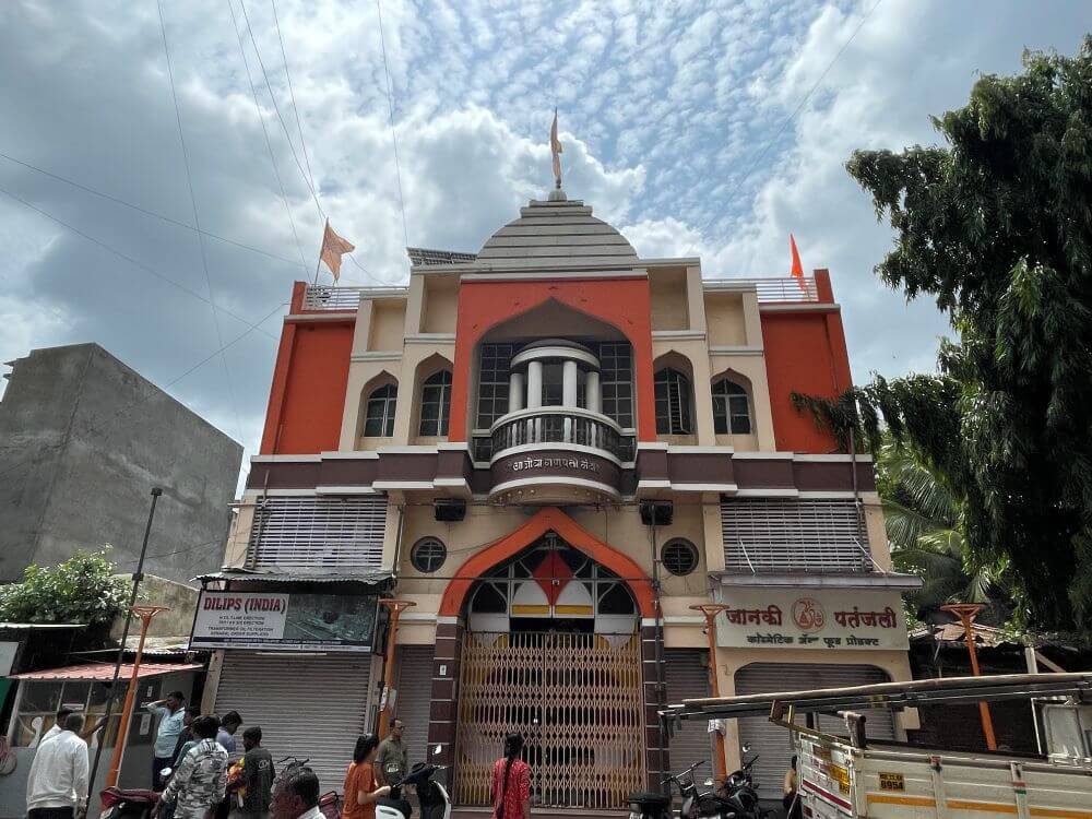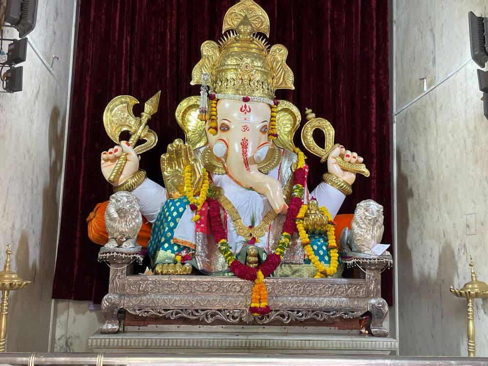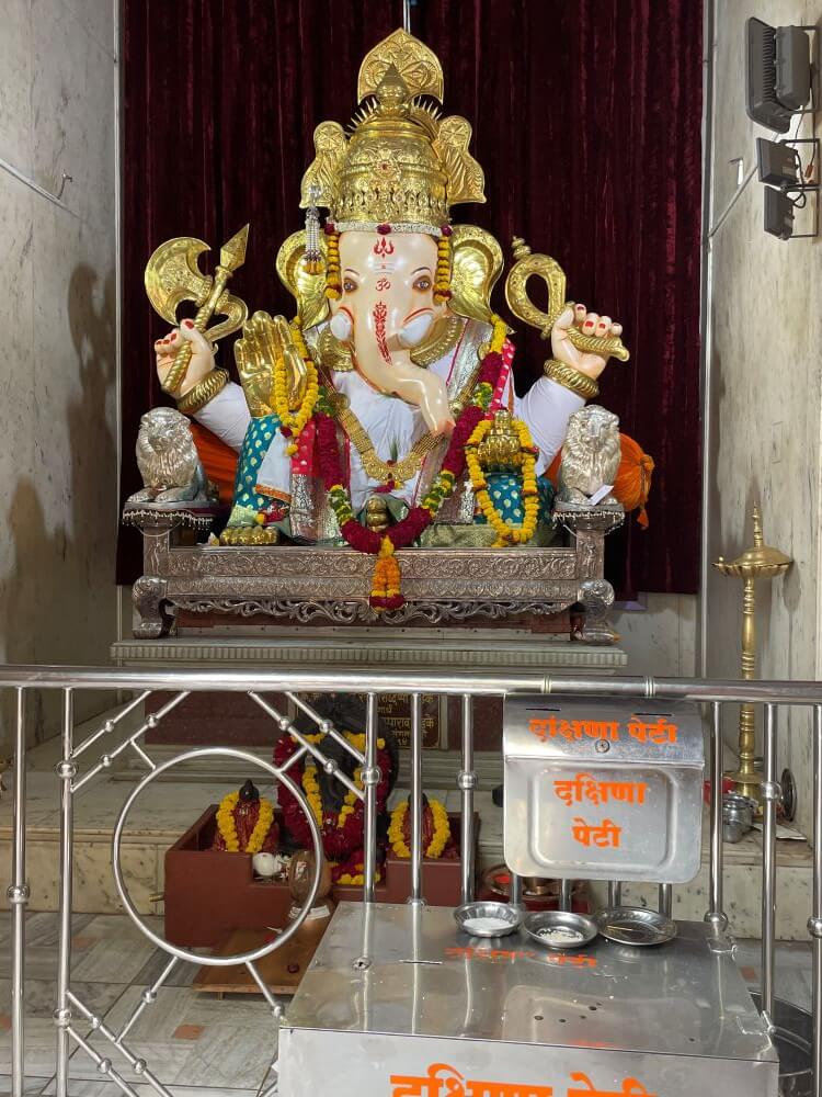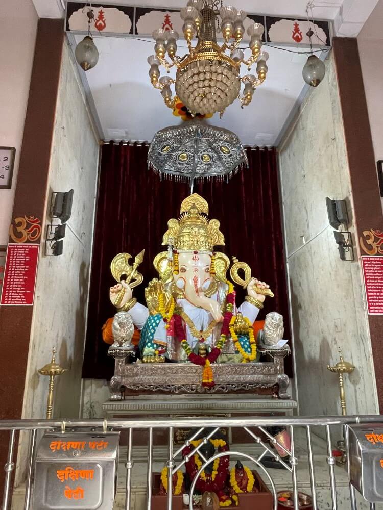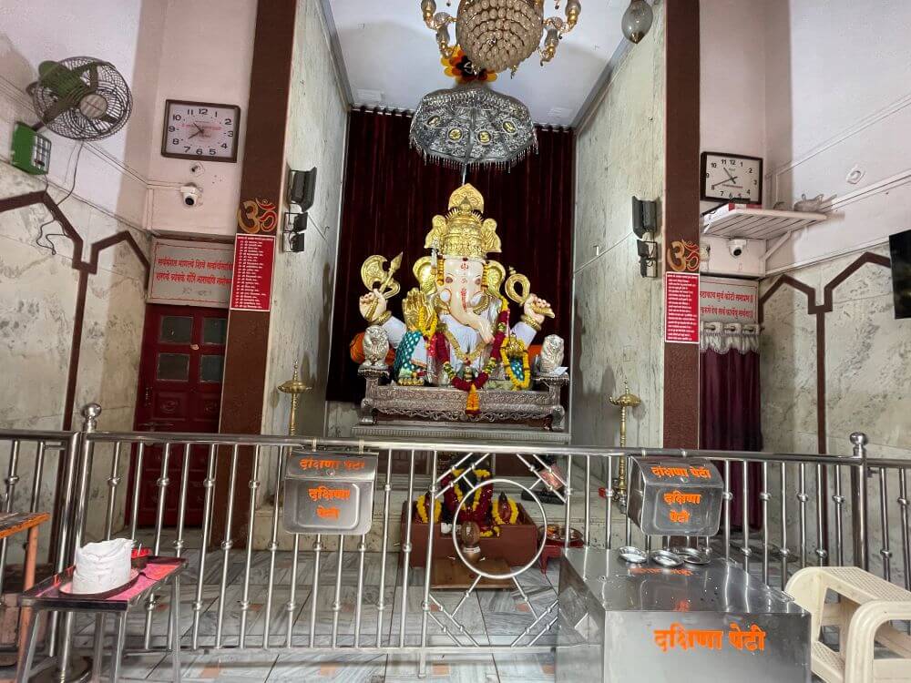 बाजारपेठेतील दाटीवाटीच्या परिसरात रस्त्यालगत आजोबा गणपती मंदिराची दुमजली इमारत आहे. कमानीदार प्रवेशद्वारातून या इमारतीत प्रवेश होतो. प्रवेशद्वारासमोर एका मोठ्या गर्भगृहात वज्रपिठावर आजोबा गणपतीची भव्य मूर्ती स्थापित आहे. चांदीच्या सिंहासनावर बसलेल्या या मूर्तीवरील मुकूट, दोन्ही कान, समोरील दोन्ही हात व पाय हे सोन्याचे आहेत. या चतुर्भूज मूर्तीच्या वरच्या उजव्या हातात सुवर्णाचा परशु, तर डाव्या हातात सुवर्णाचा पाश आहे. खालच्या डाव्या हातात शिवपिंडी व उजवा हात आशीर्वाद मुद्रेत आहे. मूर्तीच्या वरच्या बाजूस चांदीचे मोठे छत्र आहे. वज्रपिठाच्या खालील बाजूस काळ्या पाषाणातील गणेशमूर्ती व तिच्या दोन्ही बासूस रिद्धी व सिद्धी आहेत.