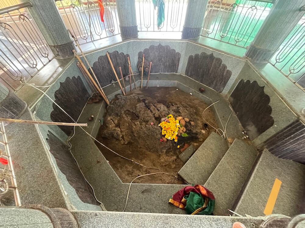 सभामंडपाच्या मधोमध आतील स्तंभांच्या रिंगणाच्या आत अष्टकोनी गर्भगृह आहे. हे गर्भगृह चार फूट खोल आहे. अर्धखुल्या स्वरूपाच्या या गर्भगृहात उतरण्यासाठी पायऱ्या आहेत. गर्भगृहाच्या प्रवेशद्वारात मेजावर पद्मपादुका आहेत. भाविकांना येथूनच देवाचे दर्शन घ्यावे लागते. गर्भगृहात जमिनीवर स्वयंभू पाषाण रुपात आजोबा देवाचे स्थान आहे. आठ स्तंभांवर तोललेले गर्भगृहाचे छत घुमटाकार आहे. छत मध्यभागी काहीसे खुले असल्याने त्यातून वर्षातील काही दिवस मध्यान्हीची सूर्यकिरणे व रात्री चंद्राची किरणे देवास अभिषेक घालतात. गर्भगृहाच्या बाह्यबाजूने सभामंडपात प्रदक्षिणा मार्ग आहे.
