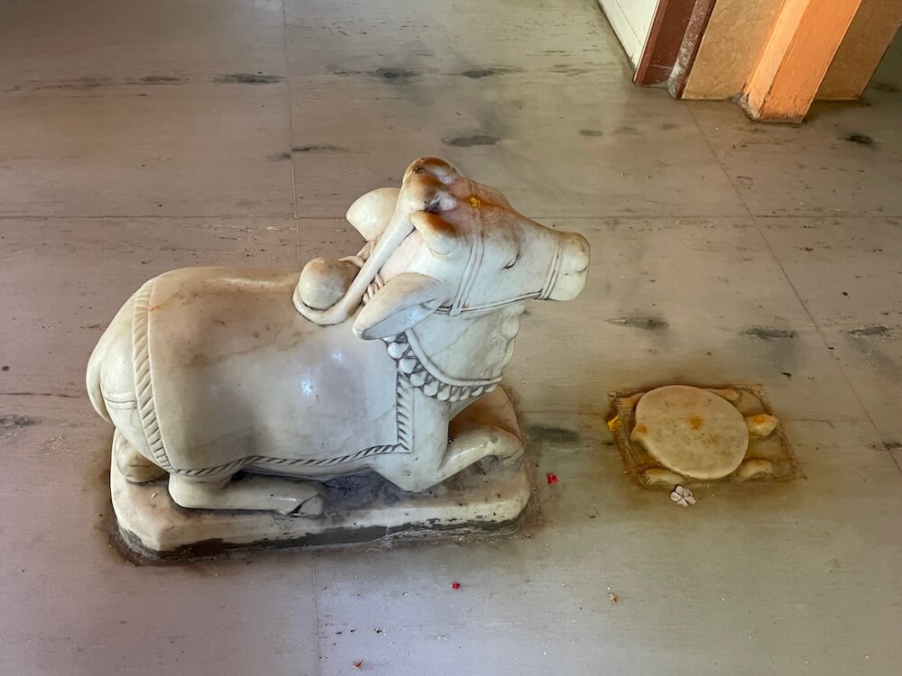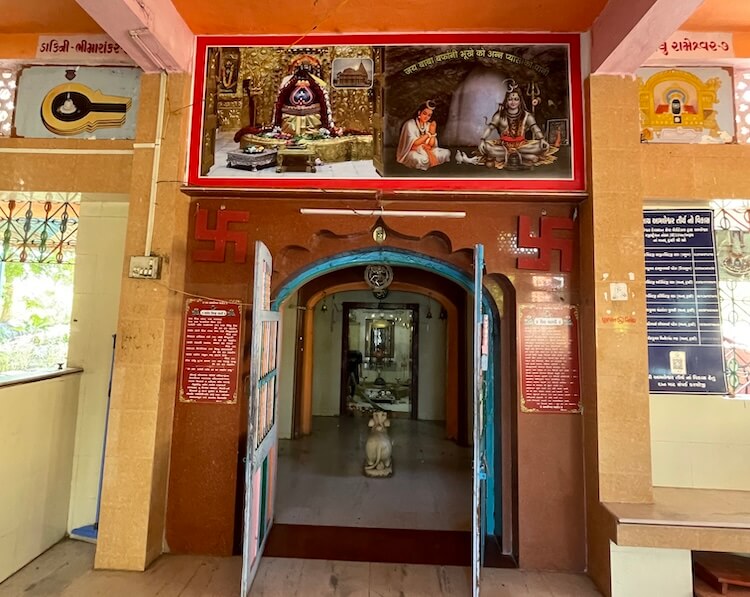 Kantheshwar and Shringeshwar Mahadeva. Each of these five icons possesses a distinct shape. Among them, the Amareshwar Mahadeva shivlinga is said to be swayambhu. The pindi (sacred stone) of Shringeshwar Mahadeva is the smallest in size. Nearby, upon an elevated platform, reside the murtis of the Navagrahas (nine planets). Adjacent to them are small marble icons of Vishnu, Dattatreya and Siddhivinayak Ganesha. On the right side of the assembly hall, tiered seating is provided for devotees, while the upper sections are adorned with images of the Jyotirlingas. In the upasabhamandapa, a marble Nandi sits upon the floor, facing a tortoise icon. The antarala houses Harjai Mata on the left and Hanuman on the right. Inside the garbhagriha, a cylindrical shivlinga is enshrined within a large panchadhatu (five-metal alloy) shalunka, sheltered by a serpent’s hood.