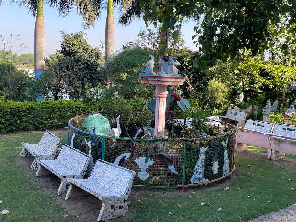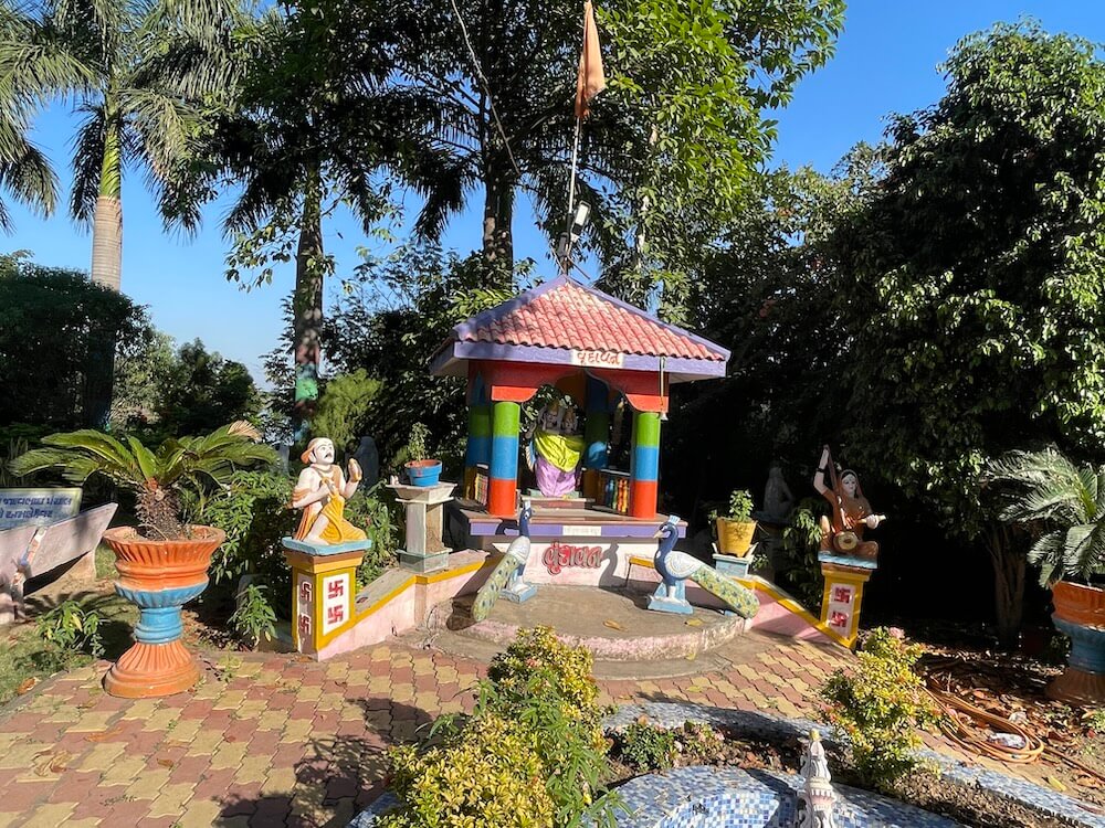 To the right of the temple stands an ancient Peepal tree, with a murti of Lord Vishnu enshrined in a niche upon its platform. Opposite this, a depiction of Vrindavan has been created, featuring murtis of Radha, Krishna and Saint Mirabai. The gardens are further adorned with fountains and sculptures of monkeys and peacocks. Facing this is the ‘Bhaktidham’ structure.
