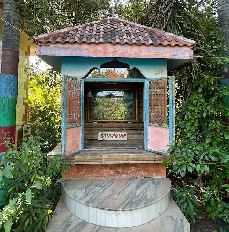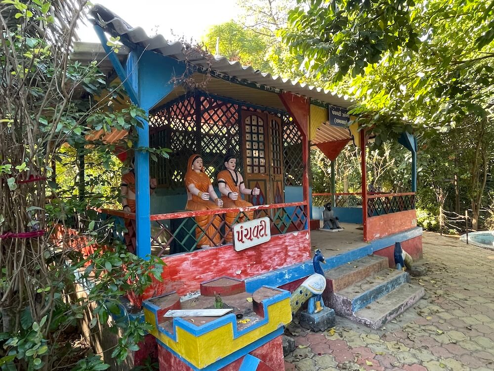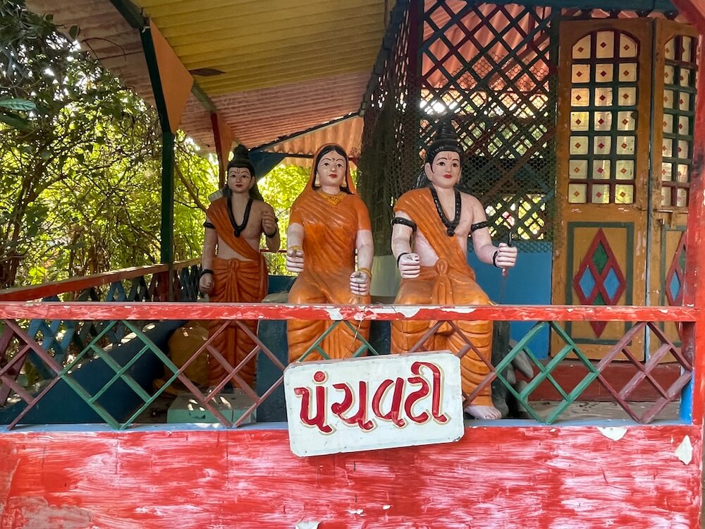 Kshemkalyani Mata, Harsiddhi Mata, Gayatri Mata and Jalaram Bapa. A shrine for Khodiyar Mata is also present. Adjacent to ‘Bhaktidham’, upon a raised plinth, sits the murti of the holy man Sitaram Maharaj. Beside it, the ‘Panchavati’ hut of Shri Rama and Sita has been recreated, featuring seated murtis of the divine couple upon a pedestal, with Lakshman standing behind them. Throughout the temple complex, various sculptures evoke such mythological scenes. In one area lies Shabridham, while the Ashoka Vatika section features a sculpture depicting the meeting of Sita and Hanuman. In the Rama temple near the Ashoka Vatika; murtis of Shri Rama, Lakshman, Sita are enshrined.