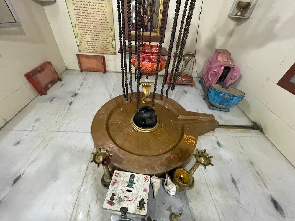 Above it hangs an abhishekpatra (vessel for ritual pouring) topped with a brass canopy. Niches in the rear and right walls of the sanctum house marble murtis of Mother Parvati and Ganesha, respectively.