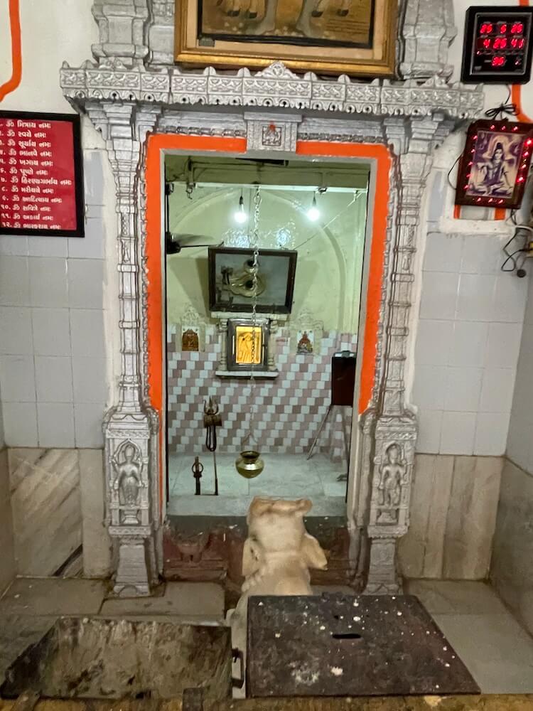 Inside the temple, in front of the sanctum, stands a marble statue of Nandi. The temple’s entrance is intricately carved. Below the doorway lies a Kirtimukh (demonic face motif), while above, on the lintel, resides Lord Ganesh.