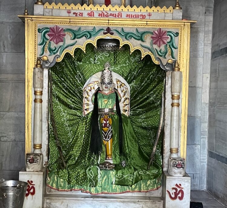 The middle sanctum is the abode of Matangi Modheshwari Mata. The original seat of Goddess Modheshwari is at Modhera in the Mehsana district. Modhera is considered the ancestral homeland of the Modh community of Gujarat. Modheshwari is an ancestral folk deity and serves as the ‘Kuldevi’ (clan Goddess) for the Modh community, including the Modh Modi – to which Prime Minister Narendra Modi belongs – as well as the Modh Vanik, Modh Brahmin and Modh Patel communities. Modheshwari is considered a manifestation of Goddess Matangi and is also known as Matangi Modheshwari. A large marble lion sculpture is seated before her sanctum and a large trident is placed near the entrance. Inside, upon a Vajrapith (pedestal) within a marble canopy, the twelve-armed Goddess is seated upon a lion. Consecrated on 8 December 1994, the idol is elegantly dressed and holds various weapons, a Mahakumbh (sacred pot) and an Akshamala (rosary).
