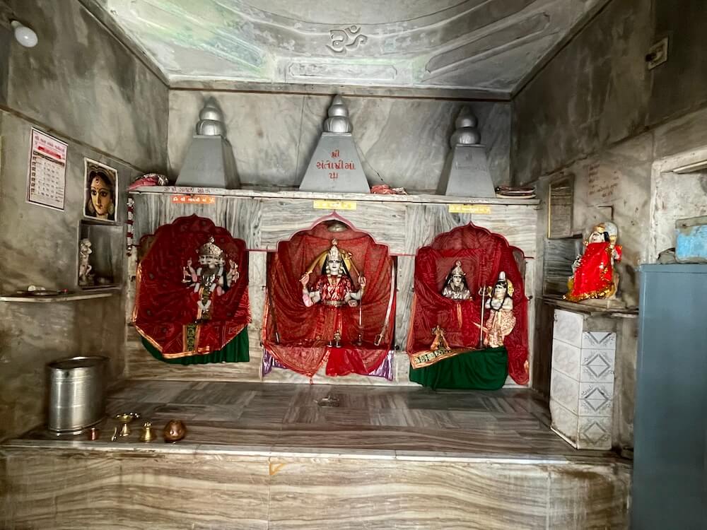 The sanctum on the far right belongs to Santoshi Mata. Here, three marble shrines are situated on a marble platform. The central shrine houses the four-armed marble idol of Santoshi Mata, holding a sword, a trident and an Akshaypatra (inexhaustible vessel), while one hand is held in the ‘Abhaya Mudra’. The shrine to the left houses a five-faced and ten-armed idol of Mother Gayatri, while the one to the right houses Mata Annapurna and Lord Shankar. These idols are beautifully adorned with garments and jewellery. Niches in the walls of this sanctum house Ganpati and Hanuman and a small idol of Amba Mata resides on a high pedestal. This sanctum was established on 25 April 1983. Architecturally, the sanctum of Ambaji Mata is topped by a dome, that of Modheshwari Mata by a triangular spire and the shrine of Santoshi Mata features a conical spire somewhat reminiscent of the ‘Urushringa’ style.