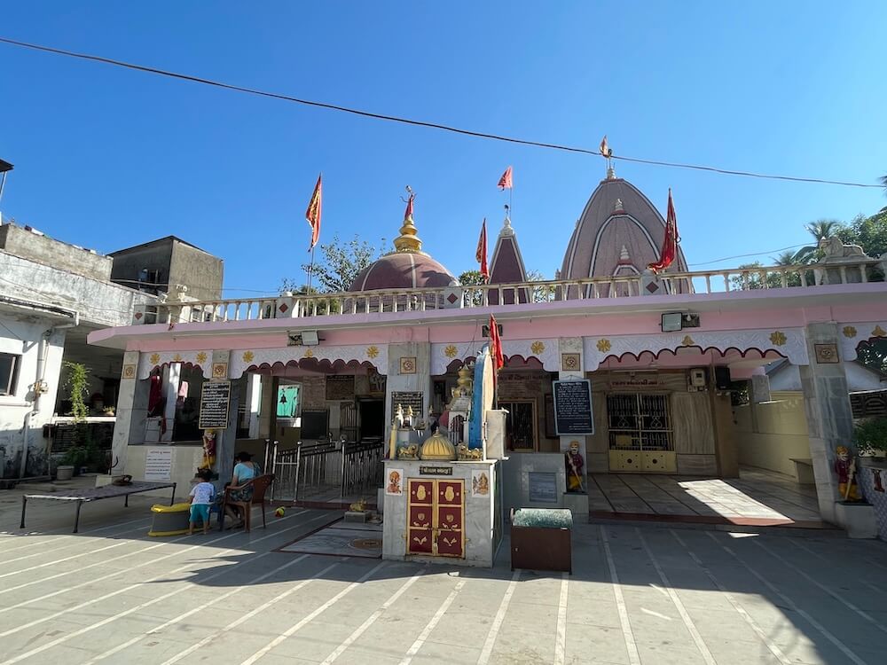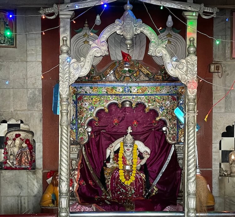 Lion sculptures flank the canopy and a niche to the left houses an idol of Shankar-Parvati.