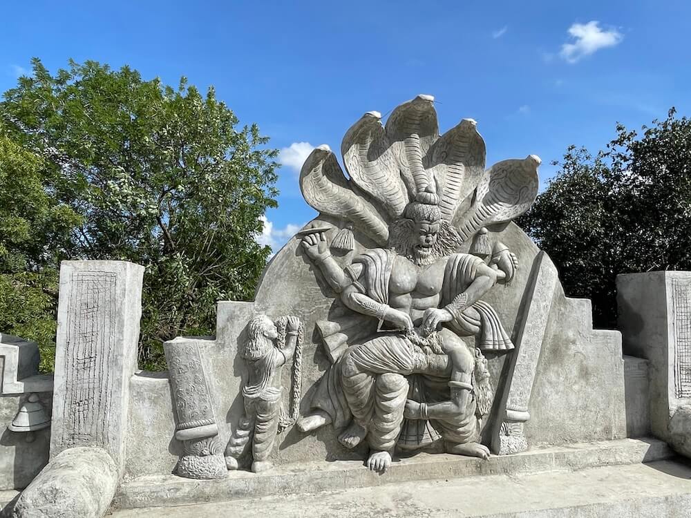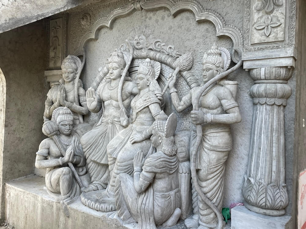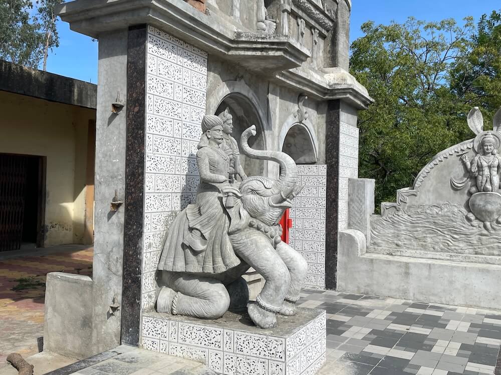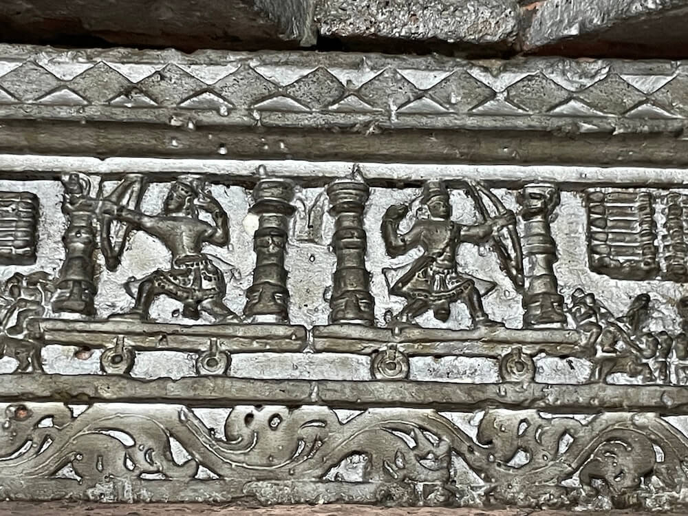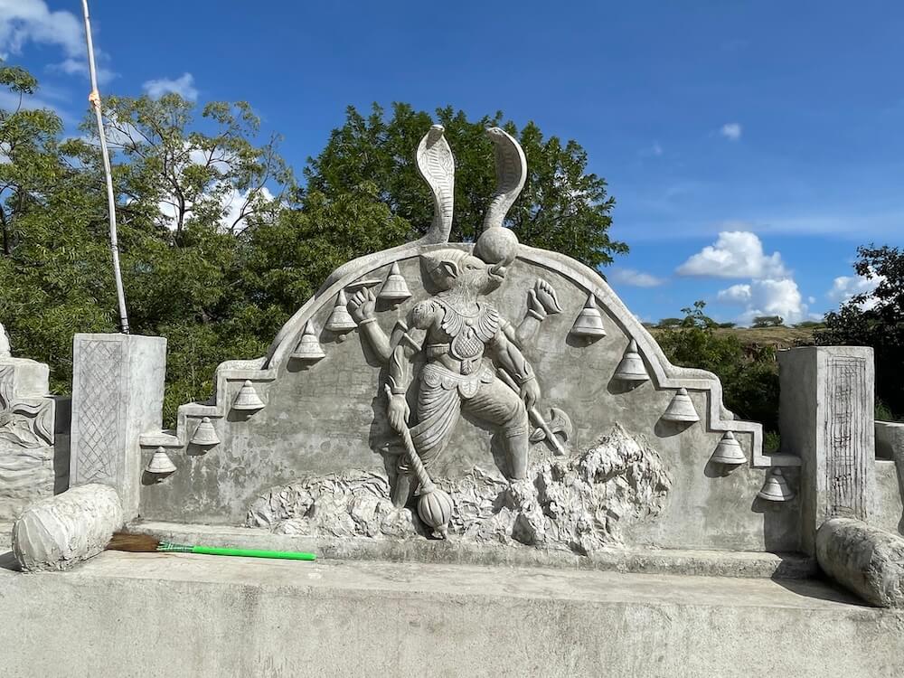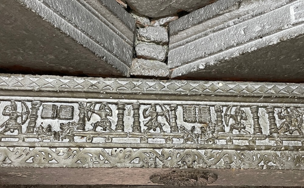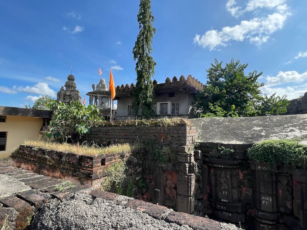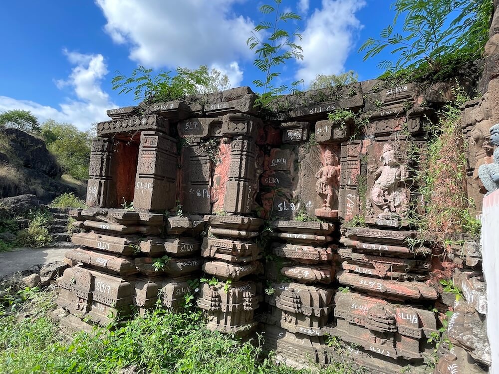 मंदिराच्या बाह्य बाजूला अधिष्ठानात गजथर आहे. यातील गजशिल्पात विविध भावमुद्रा दिसून येतात. अधिष्ठानाचा बराचसा भाग जमिनीत पुरला गेला आहे. वरील भागावर ऊंट व अश्व युद्धाचे प्रसंग कोरलेले आहेत. मंडोवरावर स्तंभशिल्पे व सुरसुंदरी शिल्पे आहेत. यात नर्तकी, शुभगामिनी, मर्दला, शुकसारिका, पुत्रवल्लभा, नृत्यगणेश, उग्र नृसिंह आदी शिल्पे आहेत. मंडोवरावर पश्चिम, दक्षिण व उत्तर दिशेला रिकामी देवकोष्ठके आहेत. मंदिराच्या मागे असलेल्या बारवाकडे जाण्यासाठी अरुंद मार्ग आहे आणि आत उतरण्यासाठी कोरीव पायऱ्या आहेत. हा जलस्रोत अक्षय असल्याचे सांगितले जाते.