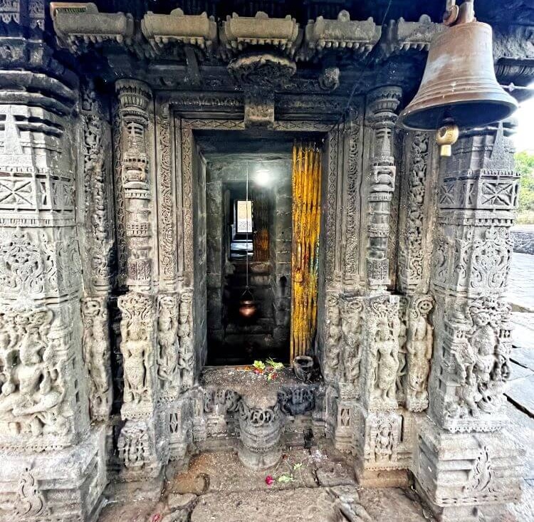 अंतराळातून गर्भगृहाकडे जाताना प्रवेशद्वाराच्या द्वारपट्टीवर सर्व बाजूंनी शिल्पे आहेत. खालील बाजूला कीर्तिमुख, डाव्या व उजव्या बाजूला वेली कोरलेल्या आहेत. अंतराळापासून सुमारे सहा ते सात फूट खोल गाभारा आहे. तेथून सहा ते सात पायऱ्या उतरून गाभाऱ्यात जावे लागते. गाभाऱ्यातील शिवपिंडीही वैशिष्ट्यपूर्ण असून शाळुंकेच्या वरील बाजूस असलेले शिवलिंग हे तीन थरांमध्ये आहे. त्यामध्ये खालील बाजूकडून वरील बाजूकडे निमुळते होत गेलेले, असा त्याचा आकार आहे. (तीन दगड एकमेकांवर ठेवल्यासारखे भासते) अशी शिवपिंडी अभावानेच पाहायला मिळते. गाभाऱ्यातून पूर्वेकडे बाहेर पडल्यावर समोर नंदीमंडप आहे. या मंडपात नंदी स्थापित असून बाजूला दोन क्षरित (खंडित) झालेले नंदी आहेत.