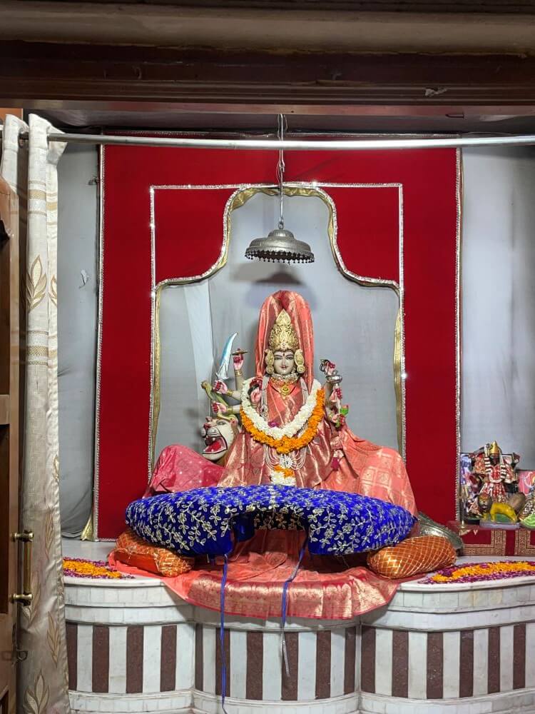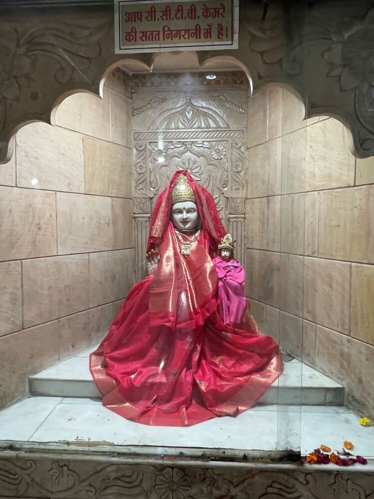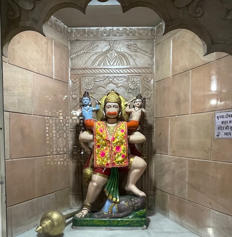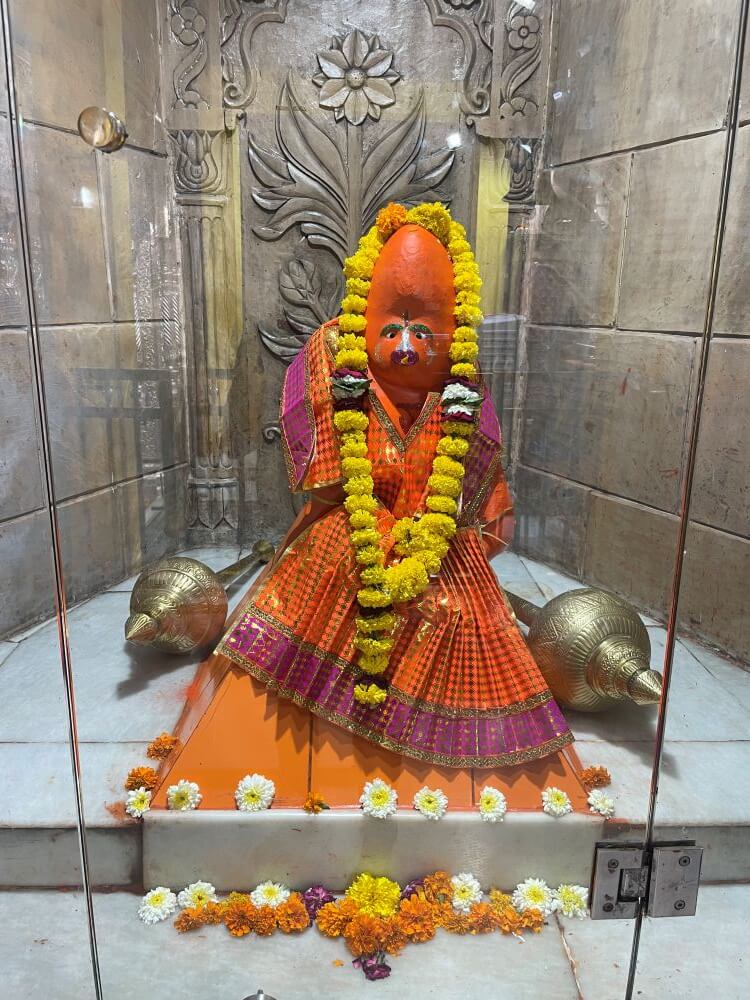 nside, garlanded with fresh flowers, the self-manifested idol of Hanuman sits majestically upon a tall vajrapeeth. Draped in resplendent cloth, the idol faces southeast and only the face is visible to worshippers. Originally around three and a half feet tall, the idol has grown taller over the decades as layers of vermilion have been applied year after year.