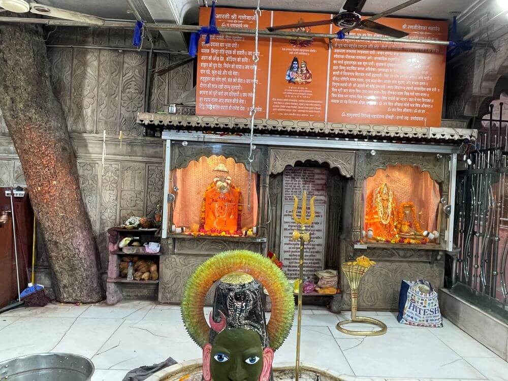 Along the circumambulatory path, shrines of other deities enrich the temple’s spiritual aura. Various forms of Hanuman are also enshrined : the mighty warrior crushing a demon underfoot while carrying Shri Ram and Lakshman on his shoulders, the humble devotee in prayer, the five-faced and ten-armed Hanuman and the meditative ascetic form. A separate shrine holds a large wooden mace, believed to be self-manifested. Within the complex are also temples dedicated to Dattatreya, Bhairav, Sheetala Mata and Shani. In Shani’s shrine, the deity sits on a marble pedestal at the center, surrounded by idols of the Navagrahas.