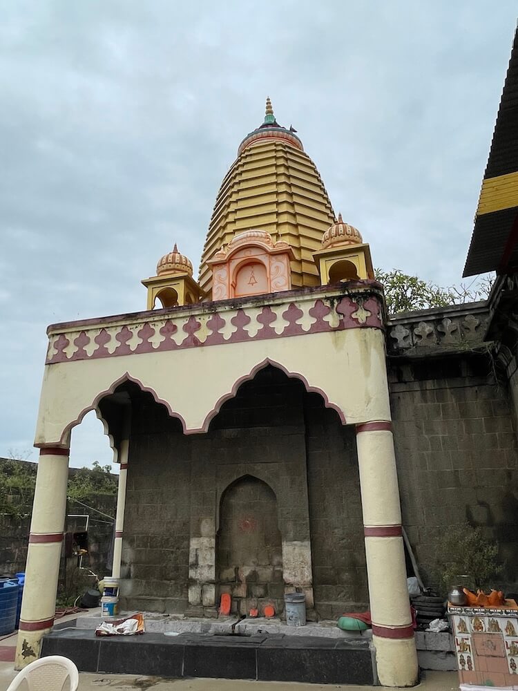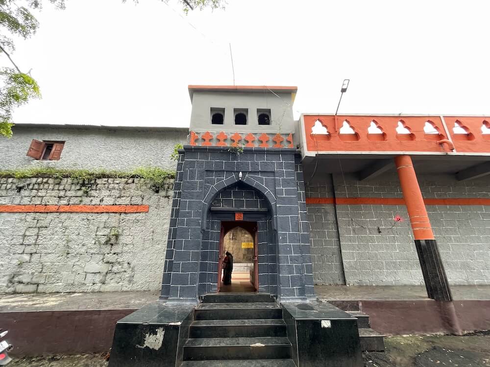 मंदिरासमोरील वाहनतळावर पूजासाहित्याची व खाद्यपदार्थांची दुकाने आहेत. मंदिरास भक्कम तटबंदी आहे. या तटबंदीत दुमजली प्रवेशद्वार आहे. मंदिर उंचावर असल्यामुळे प्रवेशद्वारास तीन पायऱ्या आहेत. पायऱ्यांच्या दोन्ही बाजूला चौथरे आहेत. चौथऱ्यांच्या पलीकडे तटबंदीला लागून प्रशस्त ओसरी आहे. प्रवेशद्वाराच्या द्वारशाखांवर उभ्या धारेची नक्षी आहे, तर ललाटबिंबावर गणपतीचे शिल्प आहे. प्रवेशद्वारास नक्षीदार लाकडी झडपा आहेत. प्रवेशद्वाराच्या आत दोन्ही बाजूला पहारेकरी कक्ष आहेत. तसेच, आतमध्ये घुमटाकार वितानावर कमळफुलाची नक्षी आहे. प्रवेशद्वाराच्या वरील मजल्यावर नगारखाना आहे.