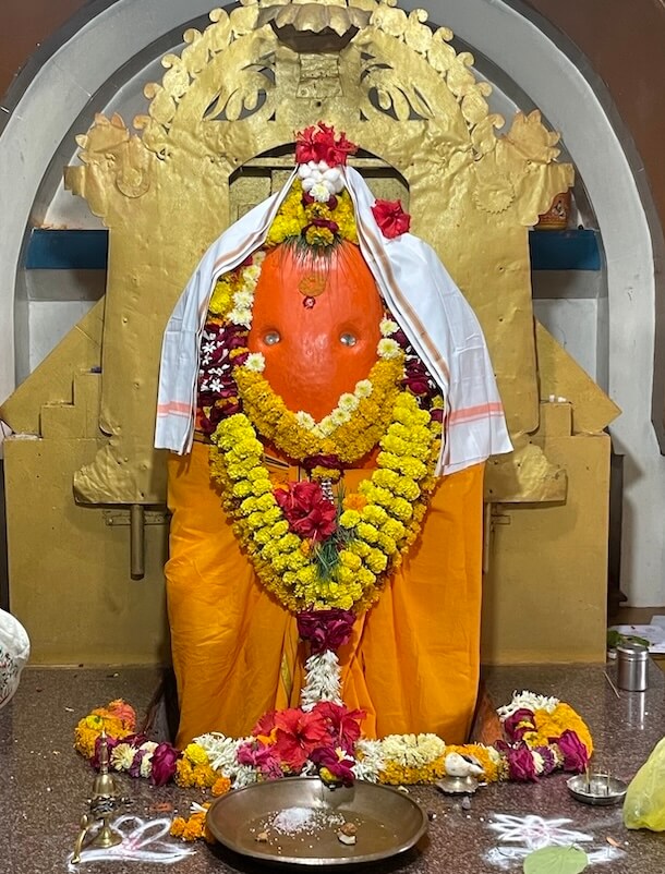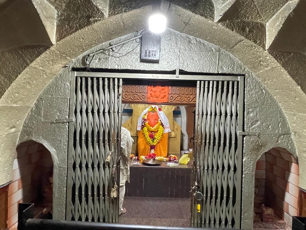 अंतराळात गर्भगृहाच्या प्रवेशद्वाराच्या दोन्ही बाजूला दर्शनी भिंतीत असलेल्या देवकोष्ठकांत गणेशमूर्ती आहेत. गर्भगृहाच्या द्वारशाखांवर उभ्या धारेची नक्षी व ललाटबिंबावर गणपतीचे शिल्प आहे. गर्भगृहाच्या प्रवेशद्वारास नक्षीदार लाकडी झडपा आहेत. गर्भगृहात वज्रपीठावर गणेशाची शेंदूरचर्चित मूर्ती आहे. मूर्तीच्या मागे नक्षीदार सोनेरी प्रभावळ आहे. मंदिराच्या बाह्य भिंतीवर मंदिराचा जीर्णोद्धार केल्याचा शिलालेख आहे. गर्भगृहाच्या छतावर चारही कोपऱ्यांत मेघडंबरी आहेत. छतावर षटकोनी शिखर आहे. शिखरात एकावर एक अशी बारा रिंगणे आहेत. शिखराच्या शीर्षभागी स्तूपिका व त्यावर कळस आहे.
