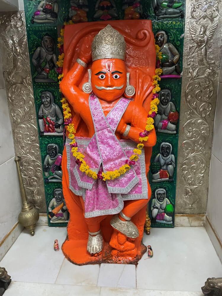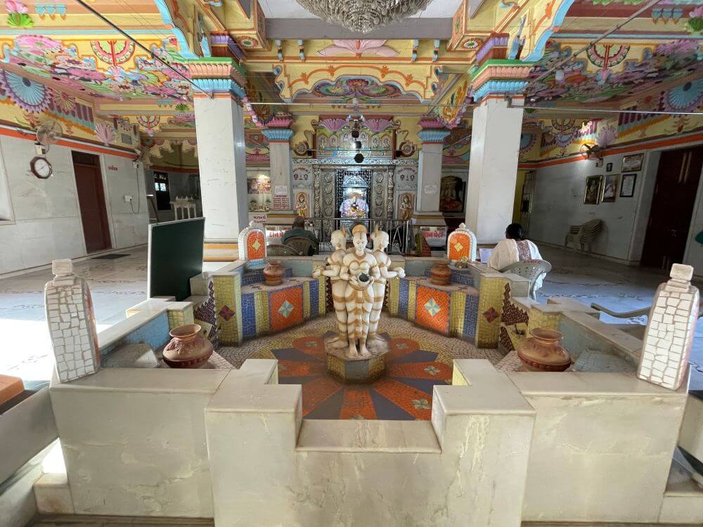Upon entering the hall, there is a decorative fountain in the center, adorned with sculptures. A large chandelier above enhances the beauty of the space. The hall is supported by marble pillars with intricate carvings. On the left side near the sanctum, there are idols of Jagannath, Subhadra and Balram. On the right, there is a vermilion-smeared idol of Hanuman.