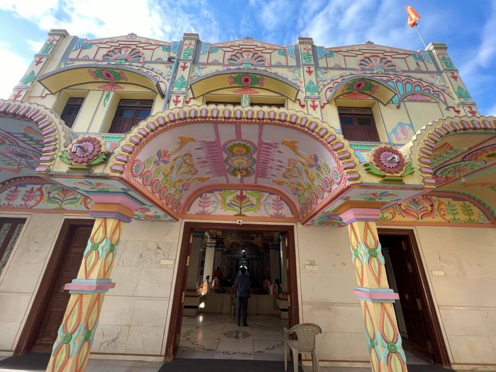 From the entrance to the temple’s spire, the structure features distinctive architectural carvings.