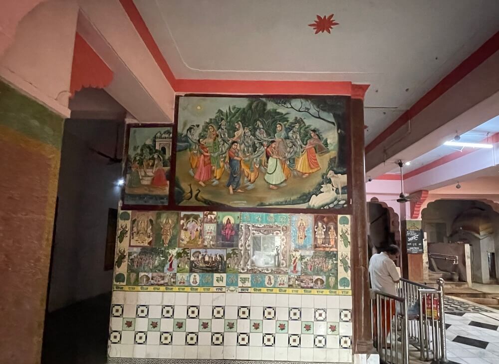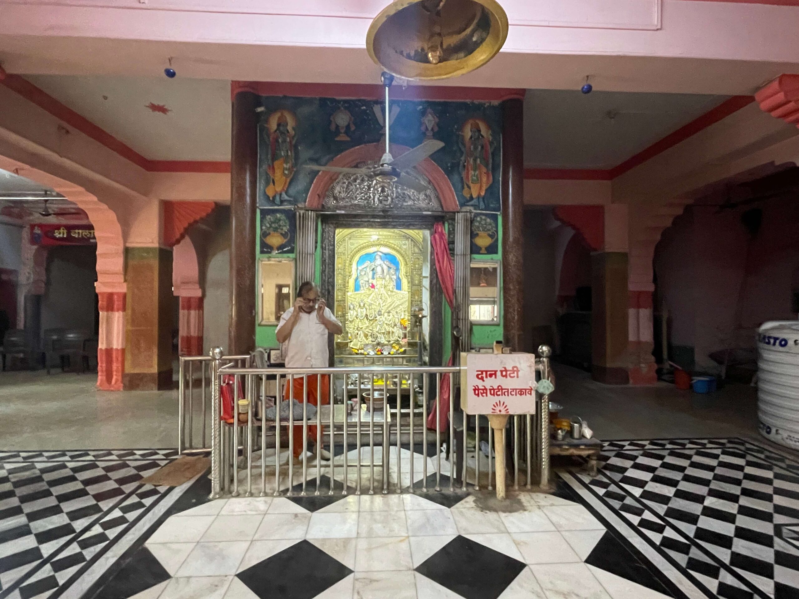 गर्भगृहाचे प्रवेशद्वार सुंदर नक्षीकाम असलेल्या चांदीच्या चौकटीचे आहे. प्रवेशद्वारावर दोन कृष्णप्रतिमा चित्रित केल्या आहेत. गर्भगृहाच्या भिंतींवर बसवण्यात आलेल्या रंगीत संगमरवरी फरशांवर फुलांची नक्षी, मोर तसेच लक्ष्मी, विष्णू आदी देव-देवतांची चित्रे आहेत. उजवीकडील भिंतीवर शेषशायी विष्णू, नारद, हनुमान, गरुड यांच्या प्रतिमा आहेत. डावीकडील भिंतीवर नर्तिकांच्या प्रतिमा आहेत. गर्भगृहाच्या प्रवेशद्वाराच्या द्वारपट्टीवर आकर्षक नक्षीकाम केलेले आहे, तसेच मध्यभागी गणेशाचे शिल्प कोरलेले आहे. गर्भगृहात सुंदर मखरामध्ये रामपंचायतन स्वरूपाची मूर्ती विराजमान आहे. मुख्य मूर्ती श्रीरामांची आहे आणि त्यांच्या बाजूला सीतामाता आहे. मूर्तीच्या डावीकडे लक्ष्मण आहेत, तर उजवीकडे भरत आणि शत्रुघ्न आहेत. खालील भागात हनुमान, नल, नील, जांबुवान आदींच्या मूर्ती आहेत. सभामंडपातील एका भिंतीवर मूळ मूर्तीचे चित्र रंगवण्यात आले आहे.