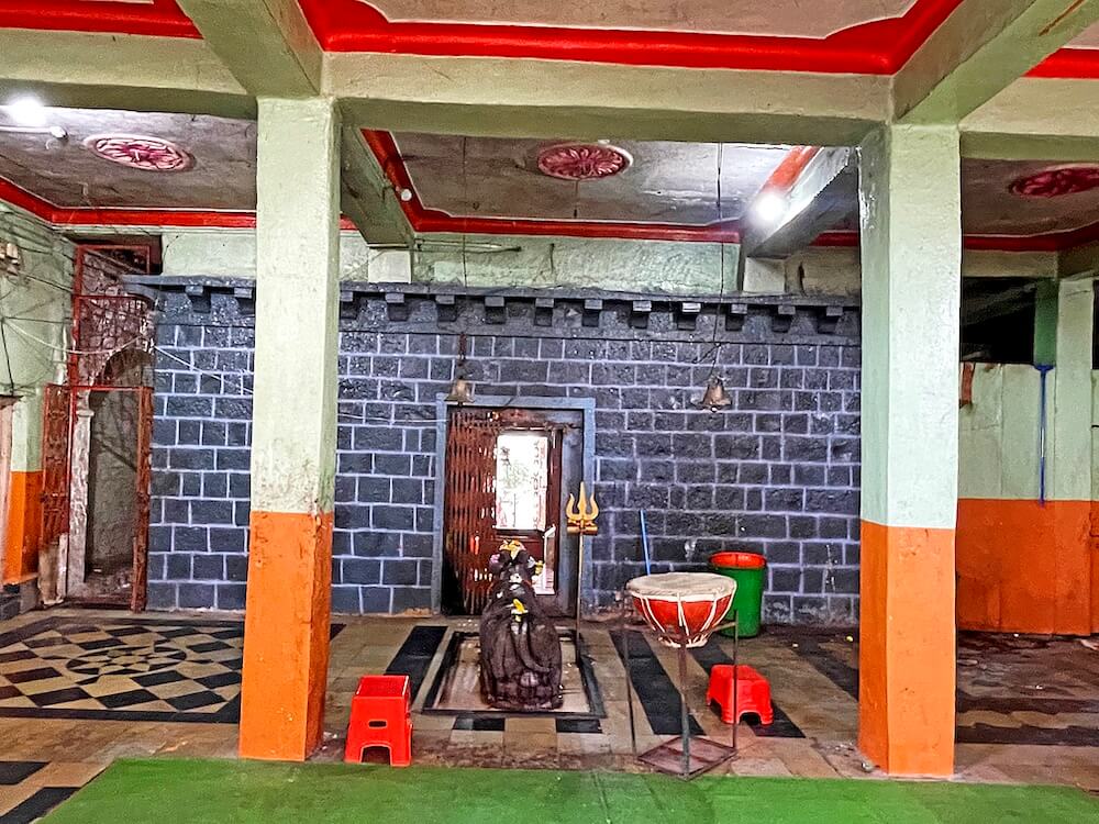 गावाच्या मध्यवर्ती ठिकाणी वसलेल्या या मंदिराकडे जाणाऱ्या रस्त्यावर एक मोठी स्वागतकमान आहे. दोन्ही बाजूस दोन चौकोनी नक्षीदार स्तंभ महिरपी कमानीने जोडलेले आहेत. त्यावरील सज्जावर बाशिंग आहे. बाशिंगातील देवकोष्ठकात गणेशाची मूर्ती आहे, तर बाशिंगाच्या दोन्ही बाजूस महादेवाच्या मूर्ती आहेत. बाशिंगावर शीर्षभागी आमलक आणि त्यावर कळस आहे. येथून पुढे मंदिराच्या पेव्हर ब्लॉक आच्छादित प्रांगणात प्रवेश होतो. मंदिरासमोर लोखंडी स्तंभांवर पत्र्याचे छत असलेला दर्शनमंडप आहे. दर्शनमंडपापेक्षा मंदिराचे प्रवेशद्वार सुमारे सहा फूट उंच आहे. या प्रवेशद्वारासमोर सुमारे पाच फूट रुंद चौथरा आहे. चौथऱ्याभोवती स्टेनलेस स्टीलचा सुरक्षा कठडा आहे. उंच चौथऱ्यावर चढण्यासाठी आठ पायऱ्या आहेत. प्रवेशद्वारास रजतपटल आच्छादित नक्षीदार लाकडी झडपा आहेत. प्रवेशद्वाराच्या वर दर्शनी भिंतीत असलेल्या देवकोष्ठात गणेशाची मूर्ती आहे. देवकोष्ठाच्या दोन्ही बाजूस नक्षीदार वामनस्तंभ व वर कळस आहे. सभामंडपाच्या मध्यभागी वज्रपीठावर नंदीची मूर्ती आहे.