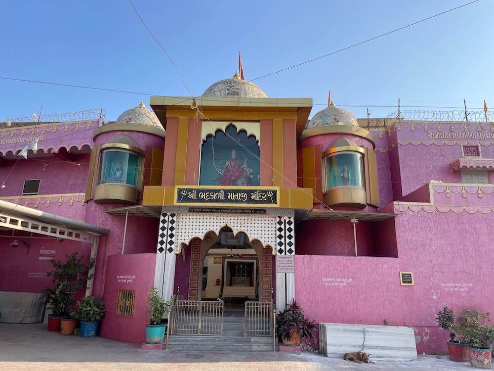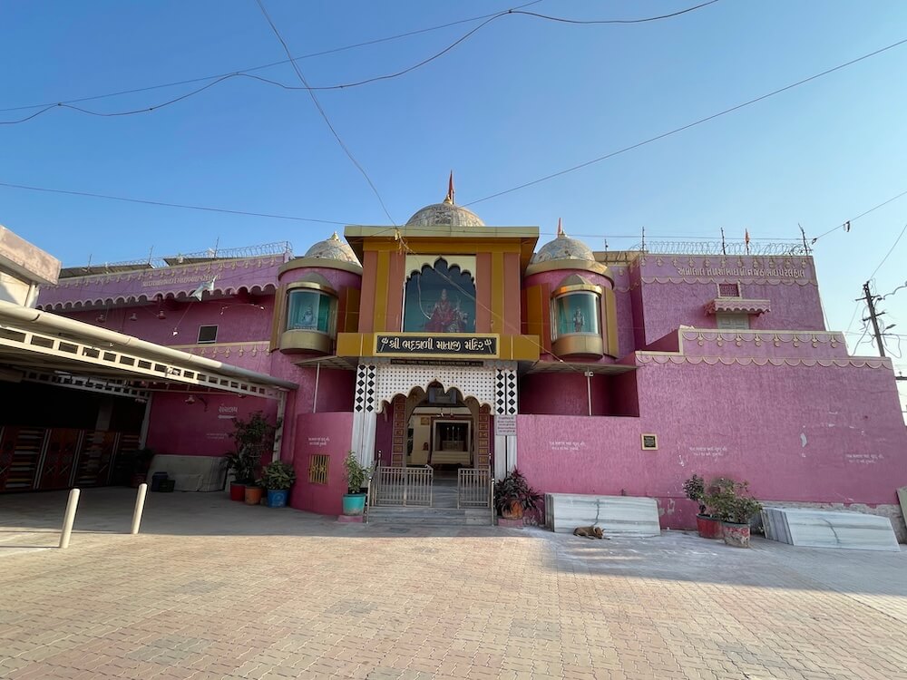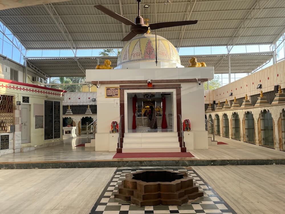 The temple is located in the heart of Bhadran village, within the main marketplace. A parking facility is situated directly in front of the temple. The entire temple complex is enclosed by a fortified wall. Entry into the temple courtyard is through a two-storey gateway within these walls. Guard’s rooms are located on either side of the entrance, with a ‘Nagarkhana’ (drum house) on the upper floor. There, an idol of Goddess Durga mounted on a tiger is installed. Within glass-enclosed chambers on both sides of the Nagarkhana, sculptures of ‘Dwarpals’ (gatekeepers) are placed.