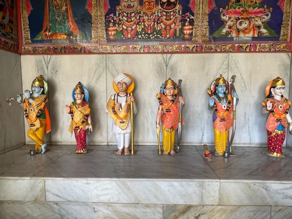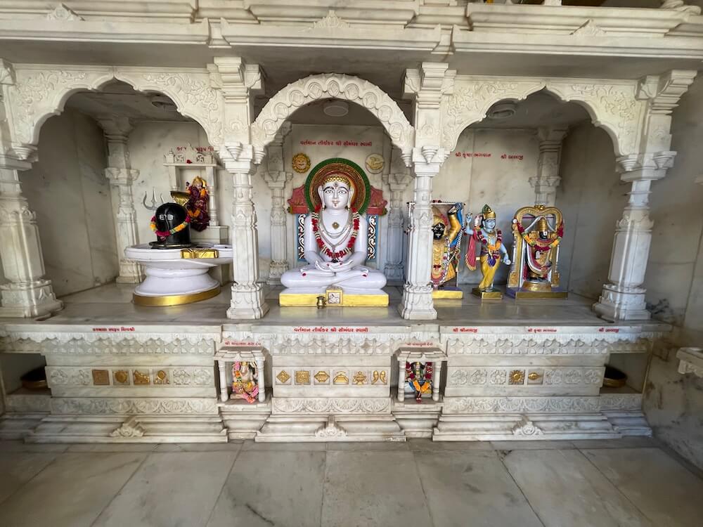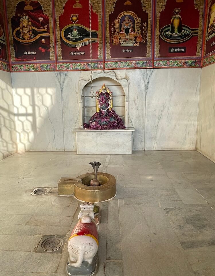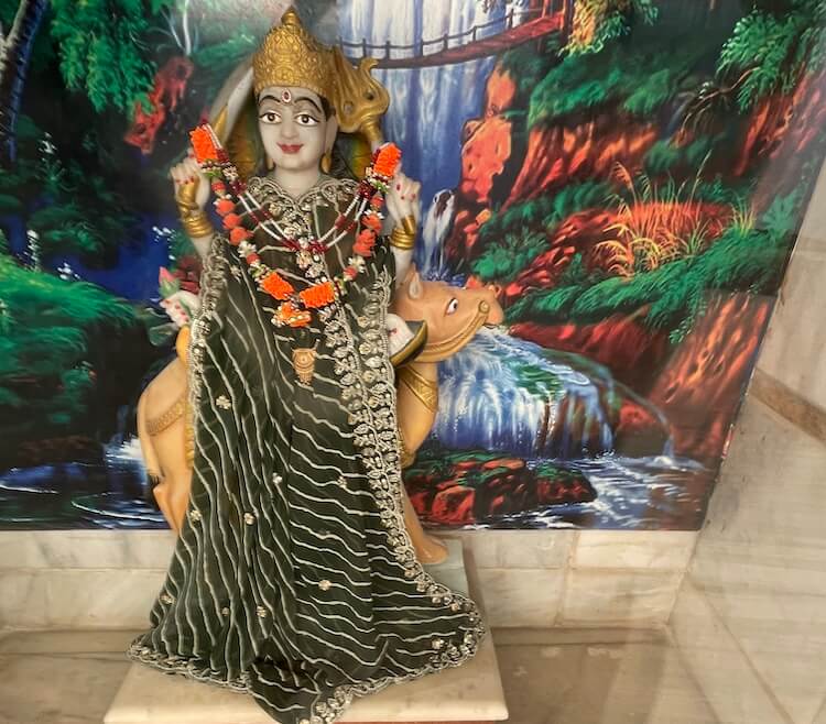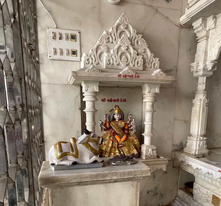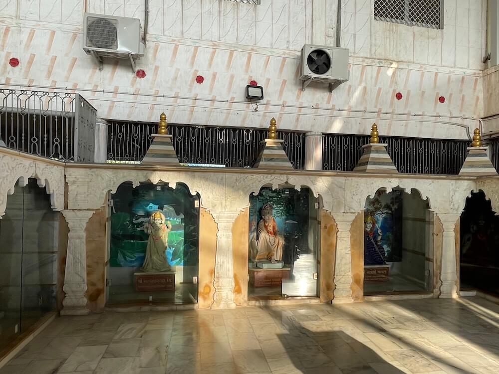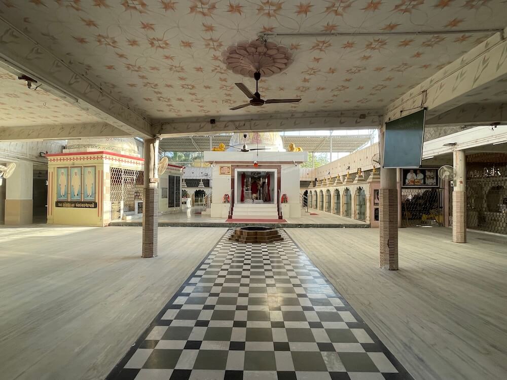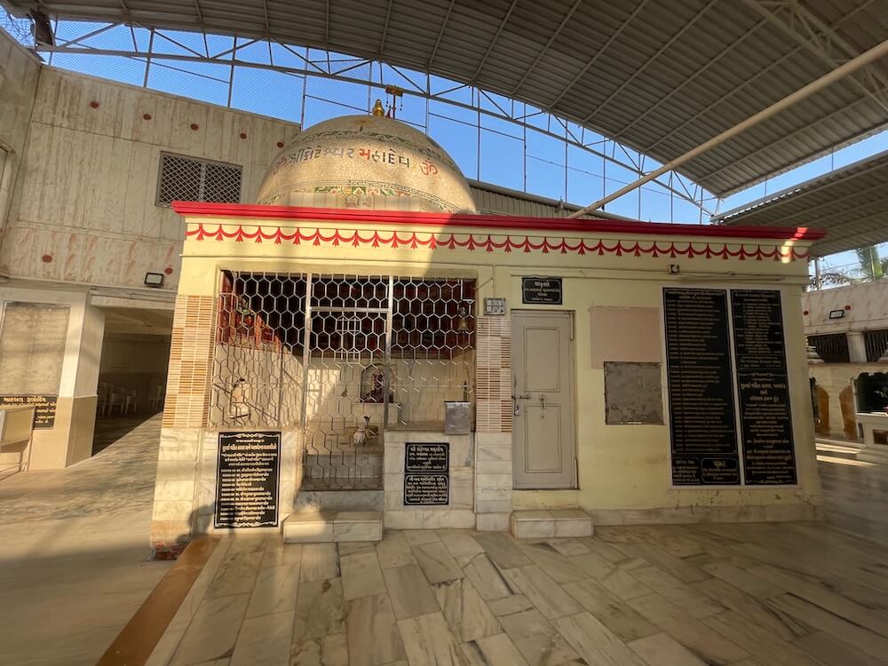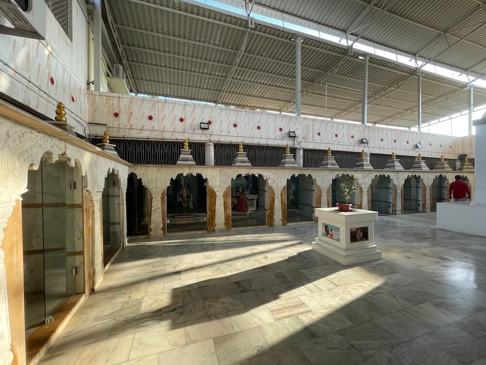 A shrine for Batuk Bhairav is also included in this area. In the second row of the courtyard, the idols of Chakreshwari Devi and a Shivpind (representation of Lord Shiva) are arranged in a specific sequence alongside Vardhman Bhagwan (the Tirthankar of Jainism), Shrinathji, Shri Krishna, Venkatesh Swami and Padmavati Devi. In the adjacent second temple, there are beautiful idols of Radha-Krishna, Jalaram Bappa and Shri Ram, Lakshman and Janaki. On the left side of the courtyard is a separate temple dedicated to Koteshwar Mahadev. At the centre of this temple is a Shivpind with an idol of Nandi nearby. An idol of Mother Parvati resides in a niche on the wall behind the ‘Pind’. A well-equipped and semi-open hall has been constructed in this courtyard for various cultural and religious programmes.