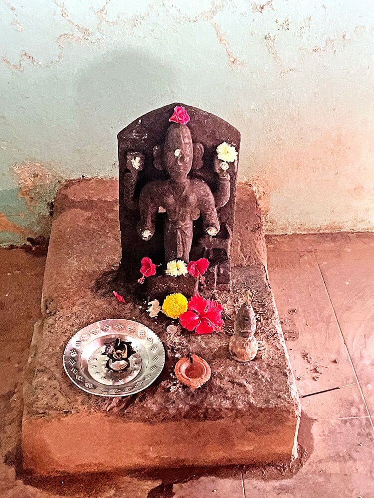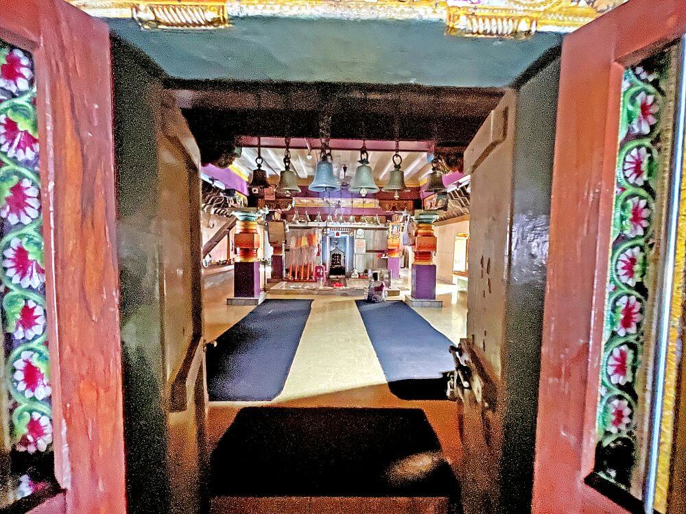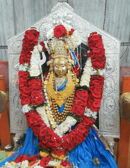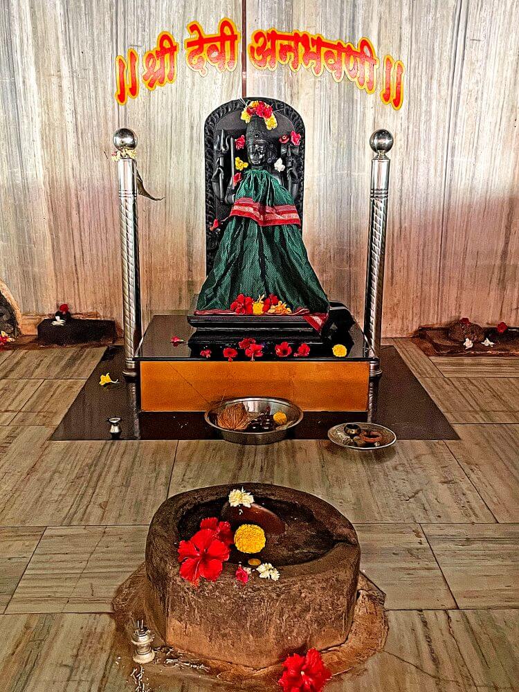 अंतराळातील गर्भगृहाच्या प्रवेशद्वाराच्या एका बाजूस नंदीची मूर्ती, तर दुसऱ्या बाजूस तरंगकाठ्या आहेत. गर्भगृहात उंच वज्रपीठावर देवीची काळ्या पाषाणातील, सुमारे चार फूट उंचीची सुहास्य वदन मूर्ती दिसते. या मूर्तीच्या बाजूला चांदीची नक्षीदार महिरप आहे. इ.स. १८१० मध्ये देवीच्या या पाषाणमूर्तीची येथे प्रतिष्ठापना करण्यात आली होती. येथे देवी महिषासुरमर्दिनीच्या रूपात आहे. खड्ग, त्रिशूल, ढाल आणि शंख धारण केलेली देवी महिषासुरावर पाय ठेवून उभी आहे. देवीच्या मूर्तीच्या उजव्या बाजूस शिवलिंग आहे. ते श्री देव ठाणेकराचे स्थान मानले जाते.