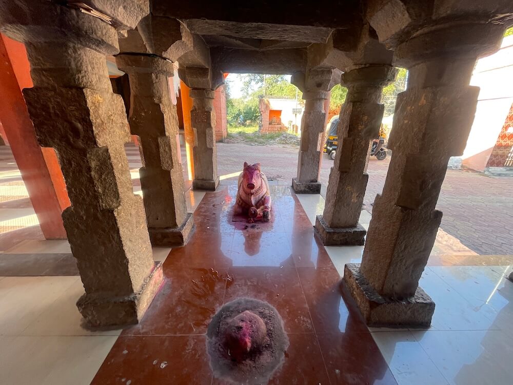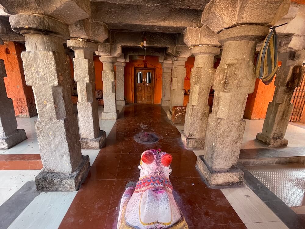 मंदिराच्या प्रांगणात सुमारे सहा फूट उंच चौथऱ्यावर गोलाकार व वर निमुळती होत गेलेली दीपमाळ आहे. दीपमाळेच्या बाजूला सुमारे आठ फूट उंच चौथऱ्यावर आठ नक्षीदार स्तंभ असलेला रंगमंडप आहे. प्राचीन काळी या रंगमंडपात देवाच्या रंगभोगासाठी नृत्य, नाटिका, गायन, वादन आदी कार्यक्रम आयोजित केले जात असत. मंदिराच्या प्रांगणात एक प्राचीन हौद आहे. येथे शुचिर्भूत होऊन मंदिरात दर्शनाला जाण्याची जुनी प्रथा आहे. मंदिरासमोर असलेल्या नंदीमंडपात वज्रपीठावर नंदीची मूर्ती प्रतिष्ठापित आहे.