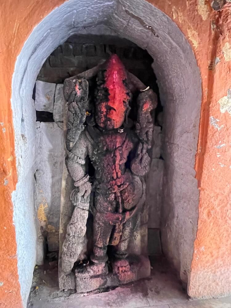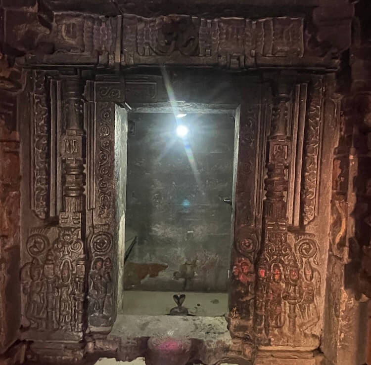 मुख्य सभामंडपाच्या पुढे अरुंद अंतराळ आहे. अंतराळात डाव्या व उजव्या भिंतीत देवकोष्टके आहेत. त्यांत गणपती व मारुतीच्या मूर्ती आहेत. त्यापुढे गर्भगृहाचे पंचशाखीय प्रवेशद्वार आहे. द्वारशाखांवर खालील बाजूस द्वारपाल, द्वारपालिका, गंगा, यमुना आदी शिल्पे आणि वरील बाजूस पर्णशाखा, पुष्पशाखा, नरशाखा, गजशाखा व स्तंभशाखा आहेत. ललाटबिंबावर गणपती शिल्प व ललाटपट्टीवर पानाफुलांची नक्षी आहे. तोरणात शिखरशिल्पे आहेत. मंडारकावर चंद्रशिला व कीर्तीमुख आहे. अंतराळापेक्षा गर्भगृह खोल असल्यामुळे त्यात खाली उतरण्यासाठी पायऱ्या आहेत.