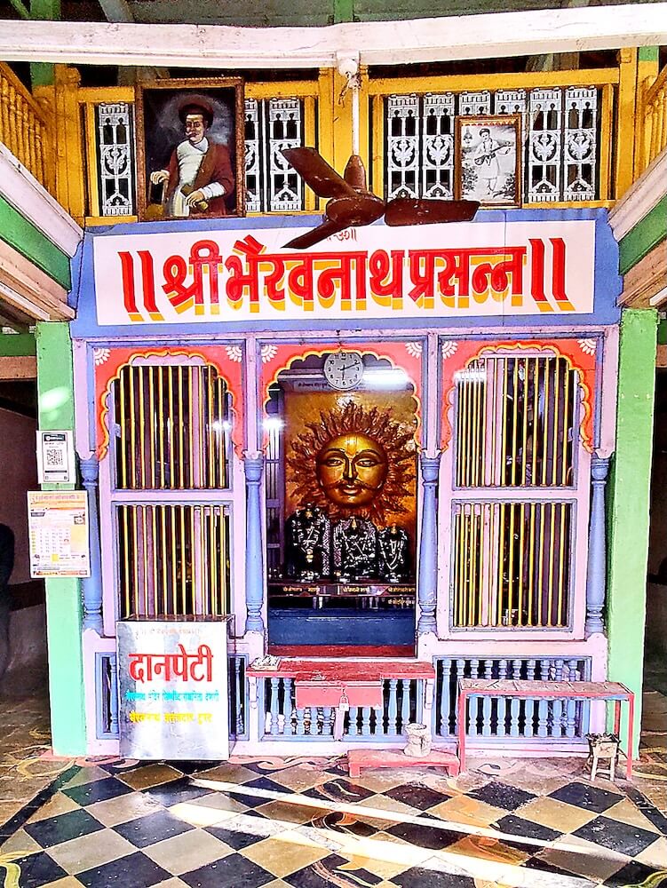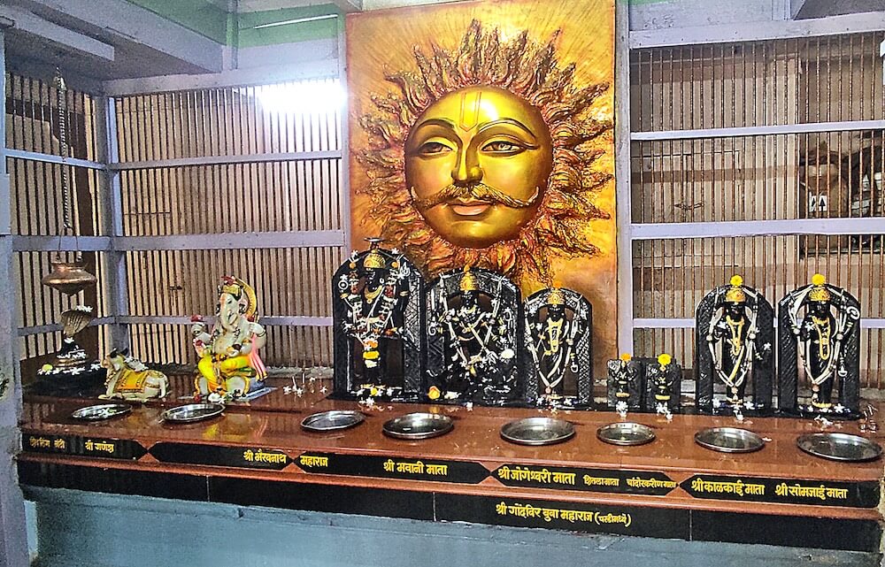 सभामंडपात जमिनीजवळ असलेल्या दगडी स्तंभपादावर लाकडी स्तंभ उभे आहेत. या सभामंडपात डावी व उजवीकडे भाविकांना बसण्यासाठी कक्षासने आहेत. सभामंडपाच्या पुढील बाजुला प्रदक्षिणा मार्ग सोडून गर्भगृहाची रचना आहे. गर्भगृहात मध्यम आकाराच्या वज्रपिठावर डावीकडून शिवपिंडी, नंदी, गणपतीची मूर्ती, मध्यभागी भैरवनाथ महाराज, भवानी माता आणि जोगेश्वरी माता यांच्या काळ्या पाषाणातील मूर्ती आहेत. या मूर्तींच्या मागील बाजूस सूर्यदेवाची मोठी प्रतिमा आहे. मूर्तींच्या डावीकडे शितलामाता व चांदोरकरीण माता यांच्या लहान मूर्ती आहेत. त्यापुढे काळकाई माता व सोमजाई माता यांच्या मूर्ती आहेत.