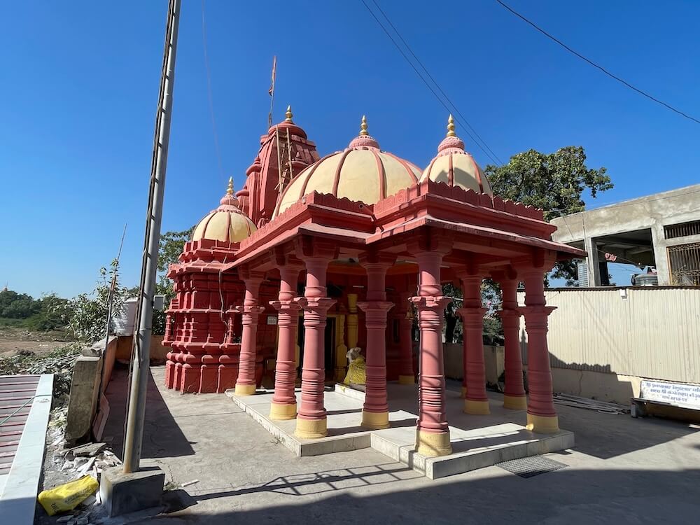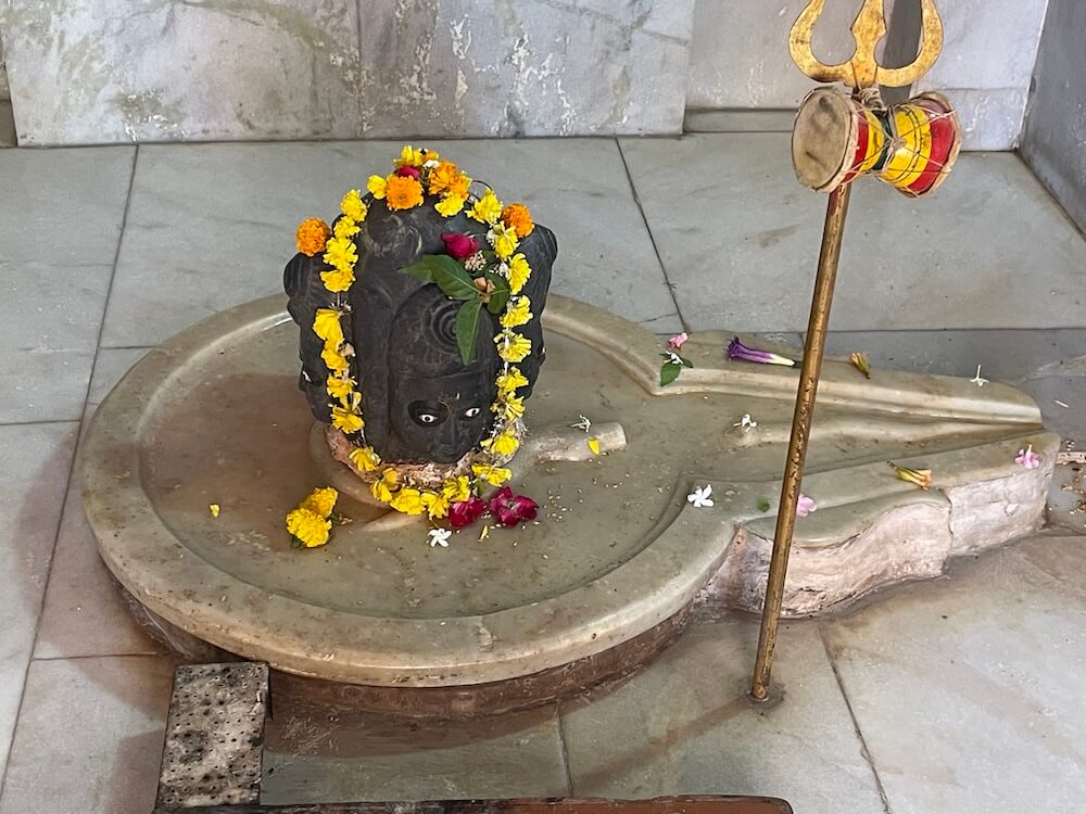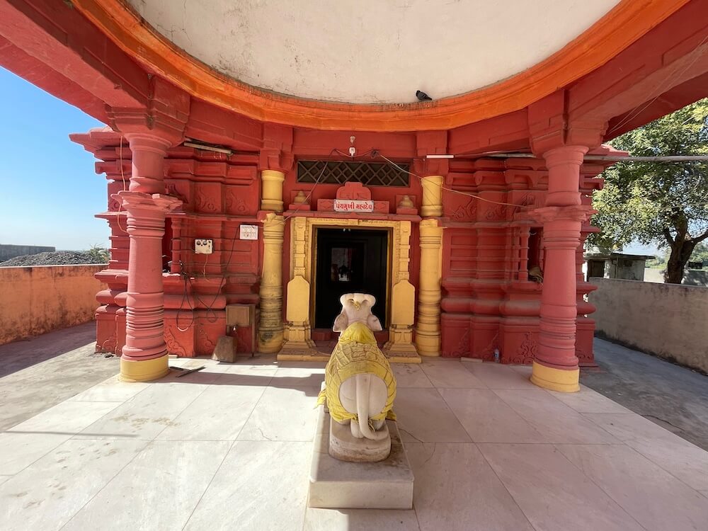 Nearby stands the Panchmukhi Mahadev Temple which is also said to be ancient. This shrine also follows the Nagara style and consists of an entrance porch, antechamber, assembly hall and sanctum. The sanctum features an Urushringa spire while the halls have domed roofs. Painted in a vibrant red this temple’s open assembly hall houses a large marble Nandi on a pedestal. The sanctum enshrines a magnificent Shivaling within a metal base featuring four carved faces of Lord Shiva, while the fifth face remains ‘Gupta’ (hidden).