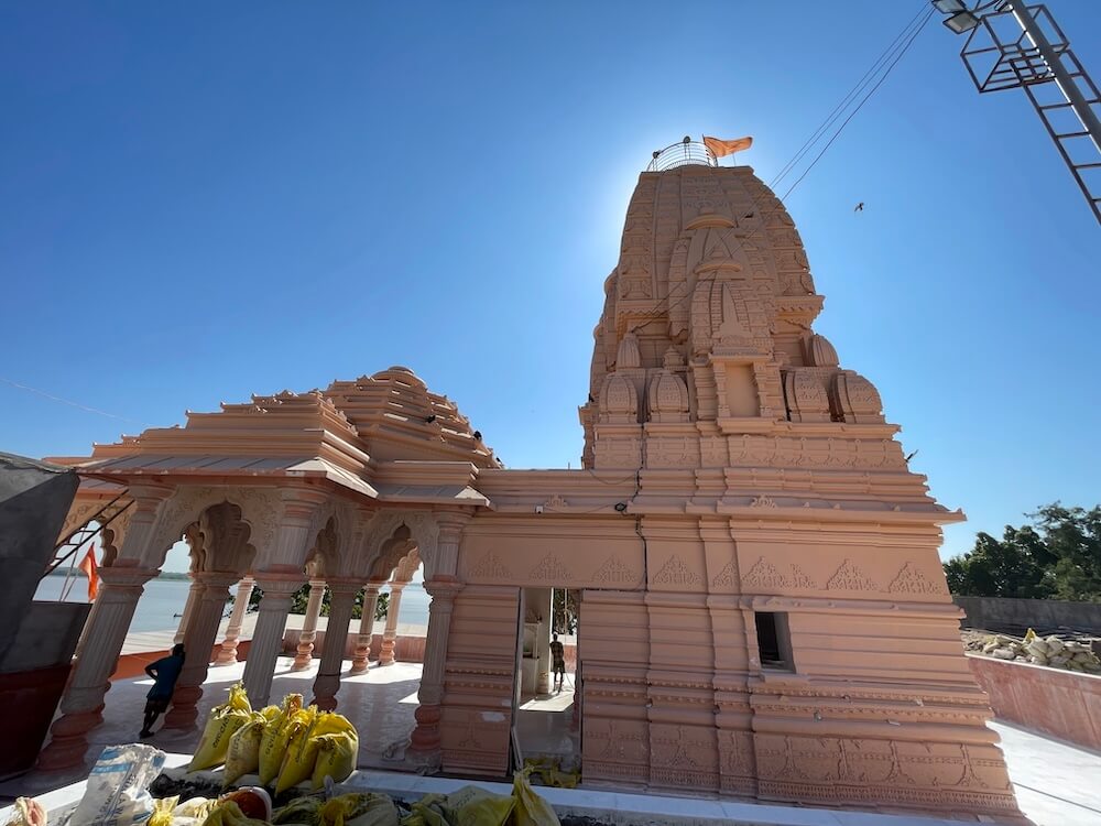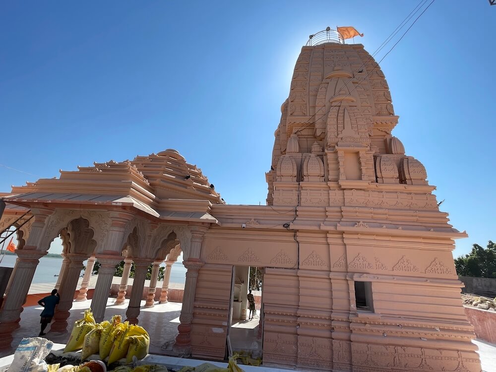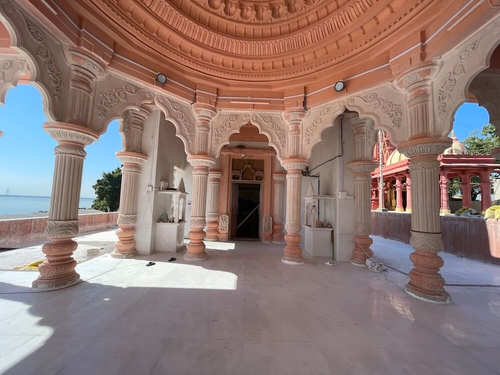 The temple is situated within an expansive compound on the banks of the Narmada. Entry is through a small iron gate and the shrine can also be reached by ascending steps constructed from the riverbank. Built in the Nagara architectural style using Rajasthani sandstone the temple comprises a Mukhamandap (entrance porch), Sabhamandap (assembly hall), Antarala and Garbhagriha.