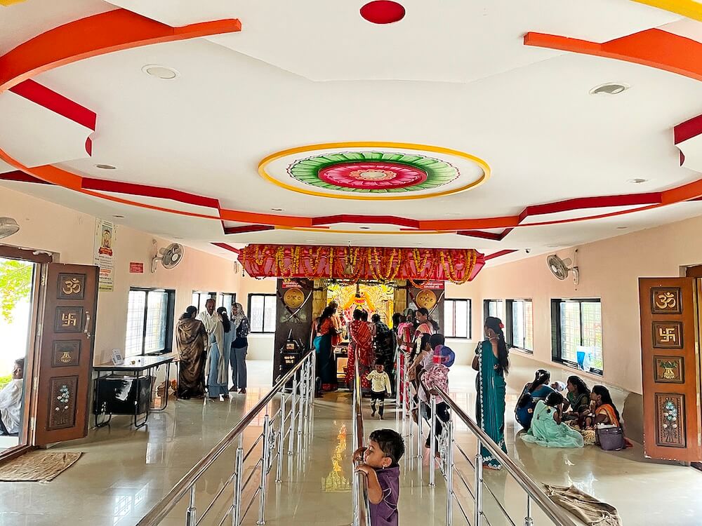 सभामंडपाचे प्रवेशद्वार प्रांगणापेक्षा उंच असल्याने प्रवेशद्वारास पाच पायऱ्या आहेत. प्रवेशद्वारात दोन्ही बाजूला शंख, चक्र, गदा धारिणी चतुर्भुज नारायणी द्वारपाल शिल्पे आहेत. प्रवेशद्वाराच्या द्वारशाखांवर पानाफुलांची नक्षी आहे, तर ललाटबिंबावर गणपती शिल्प आहे. प्रवेशद्वारास नक्षीदार लाकडी झडपा आहेत. सभामंडपास उजव्या व डाव्या बाजूला आणखी दोन दरवाजे आहेत. बंदिस्त स्वरूपाच्या सभामंडपात उजेड व हवा येण्यासाठी वातायने आहेत. सभामंडपात स्टेनलेस स्टीलचे कठडे लावून रांगांचे व्यवस्थापन केले आहे. पुढे गर्भगृहाचे प्रवेशद्वार आहे. प्रवेशद्वाराच्या दोन्ही बाजूला स्तंभांवर ढाली व तलवारी आहेत.