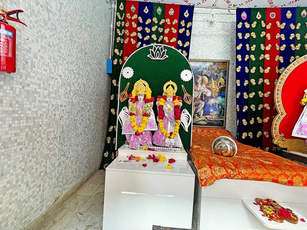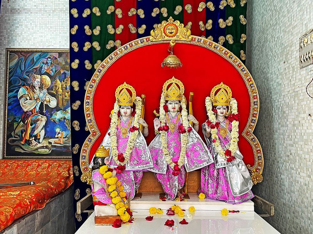 In front of the temple, a scene from Ashok Vatika -the meeting between Sita and Hanuman – is depicted with life-sized statues near an ancient tree. On the left side of the courtyard, there’s a shrine with a marble idol of Lakshminarayan and next to it, the Ram Darbar featuring beautiful idols of Ram, Lakshman and Sita, with Hanuman bowing to Lord Ram. These idols were consecrated about 25 years ago.