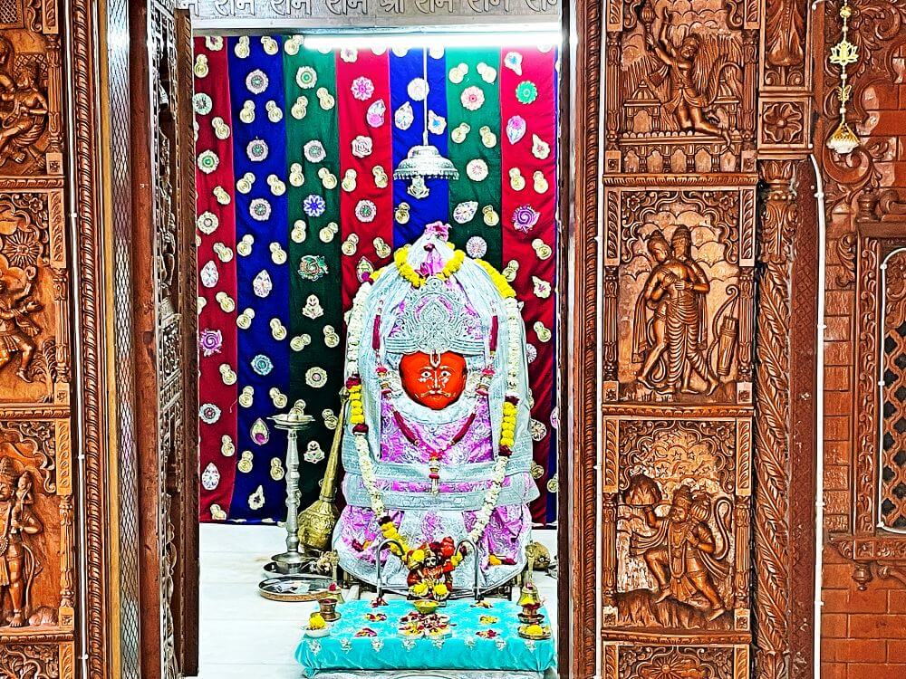 Inside the sanctum, the idol of Bhidbhanjan Hanuman has a human face with a mustache, coated in vermilion and the body painted golden. The left hand is placed on the chest and the right hand is raised to the head.