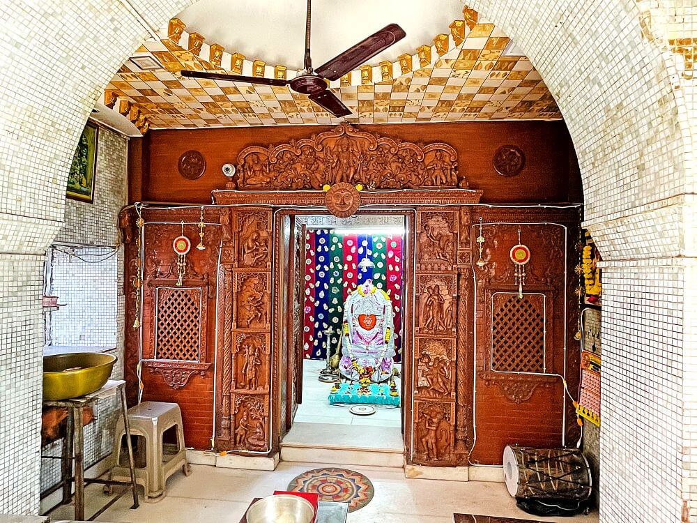 The wooden doorframe of the sanctum features carvings of Hanuman in various postures and scenes. Above the door is an image of Surya Narayan (Sun God). In the upper lintel, a carved image of Panchmukhi Hanuman is flanked by scenes showing Hanuman chanting Ram’s name and tearing his chest open to reveal Ram.