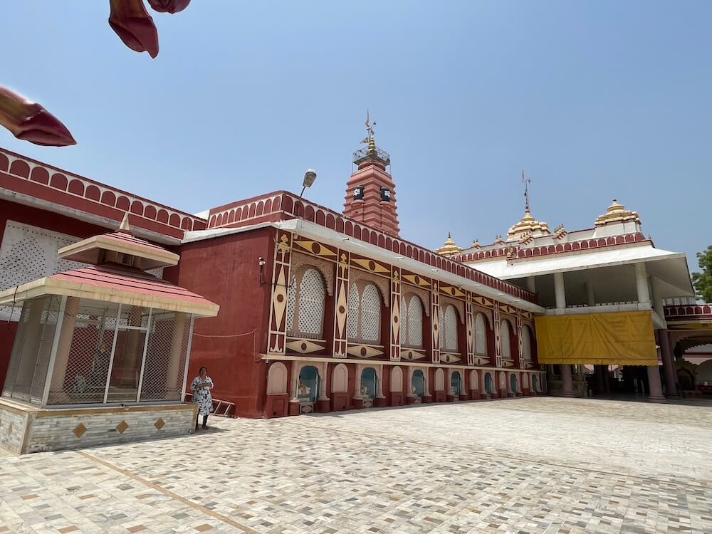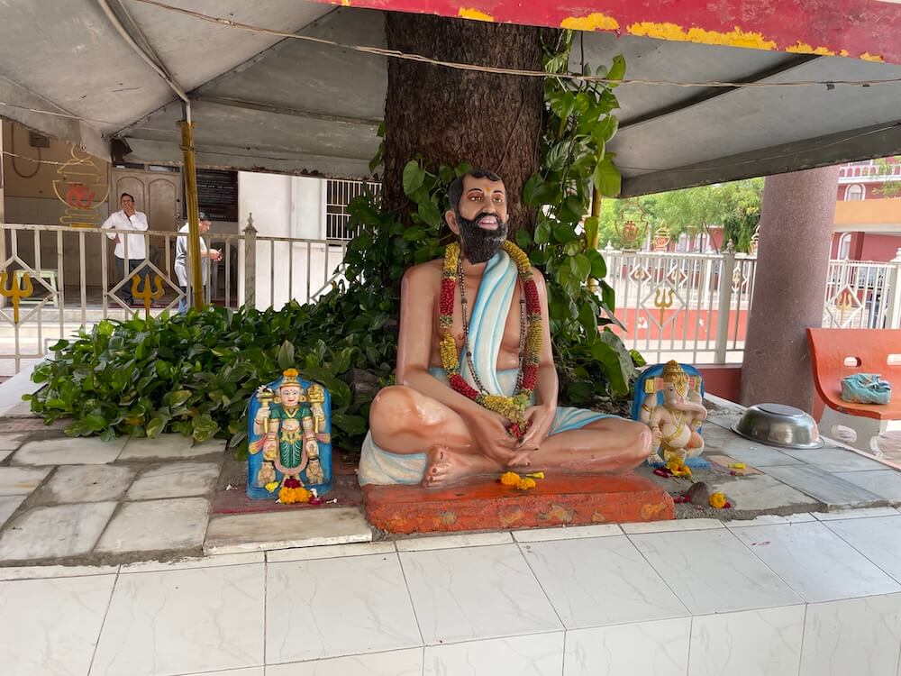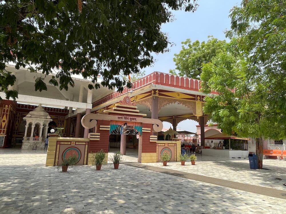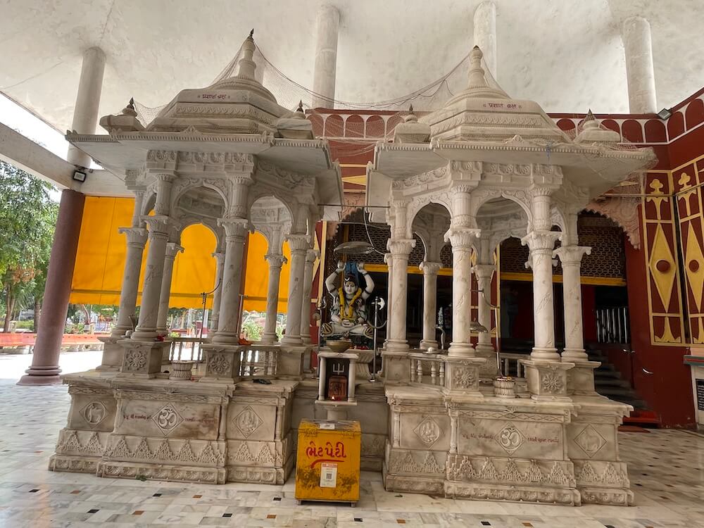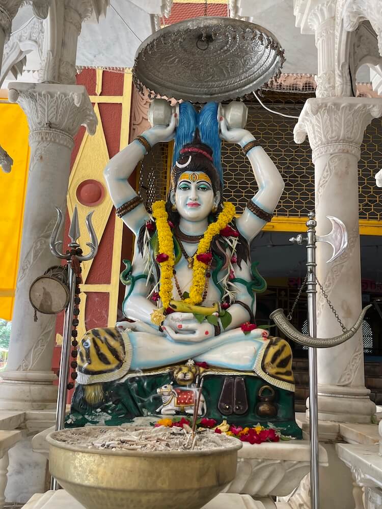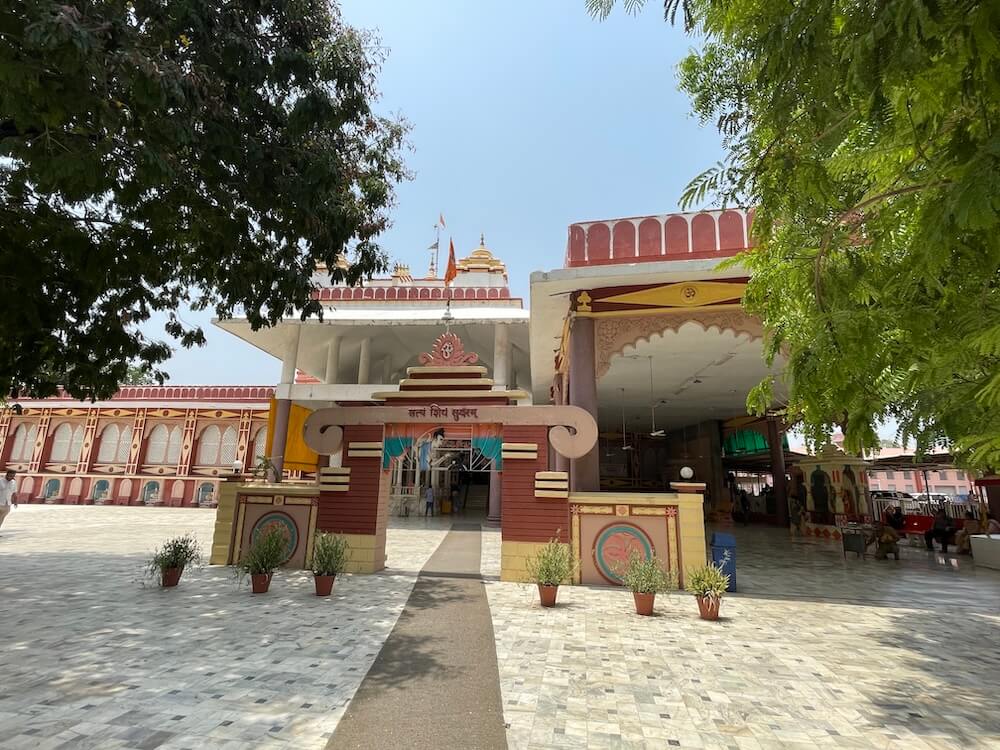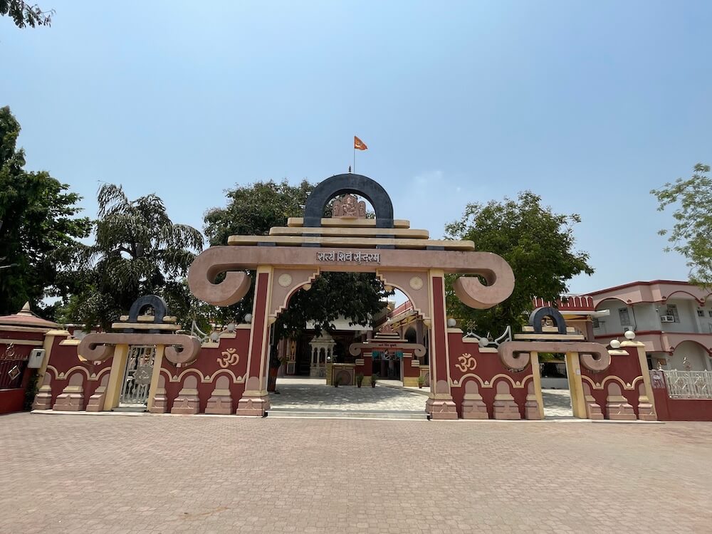 The temple is set within a spacious, walled compound. A large main gateway greets visitors with the inscription ‘Satyam Shivam Sundaram’ carved on a horizontal beam and an image of Ganesha above it in a semicircular niche. A little ahead, a smaller replica of the gateway leads toward the main temple path, adorned with a metal image of Lord Ram worshipping a Shiva Lingam. Lush with flowering trees and sacred plants, the temple ground also feature statues of Swami Vivekananda, Gaibinath Maharaj and other saints, sages and ascetics. Nearby are sculpted scenes from the Ramayana and Mahabharata. Close to the main temple are the marble-canopied samadhi sites of Savliwale Swamiji and Gaibinath Maharaj. A distinctive idol of Shiva is also located here – depicted in a meditative posture with four arms. Two hands rest in samadhi mudra, while the upper arms hold