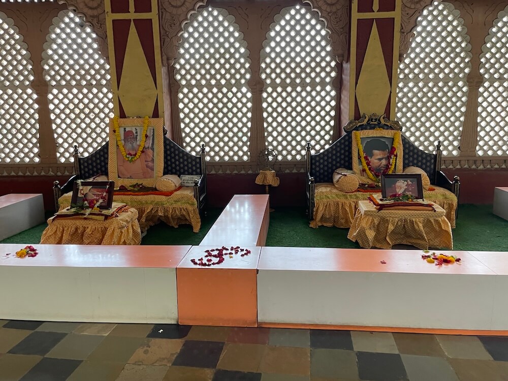 At the heart of the sanctum, the Shiva Lingam is covered by a silver cobra forming a canopy. Behind the Lingam, on the wall, is a shrine to Goddess Parvati, above which is a large image of Lord Shiva. The temple’s exterior walls are decorated with carvings of sages such as Vishwamitra and Atri, among others. Behind the temple stands a wooden Gurumandir, where various religious rites are conducted in the ‘Gebinath Yagyashala’. Near Swamiji’s image, two vehicles used by him are preserved. Within the temple complex, devotees also find the ‘Shri Annapurna Bhavan’ and a prasada griha, offering lodging and meals.