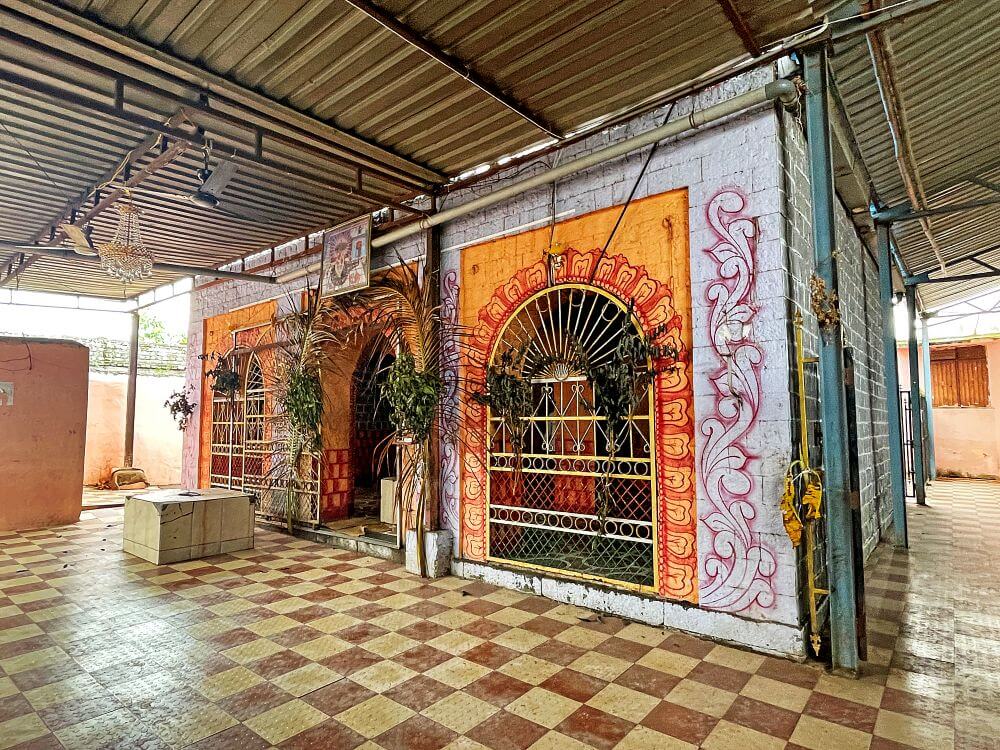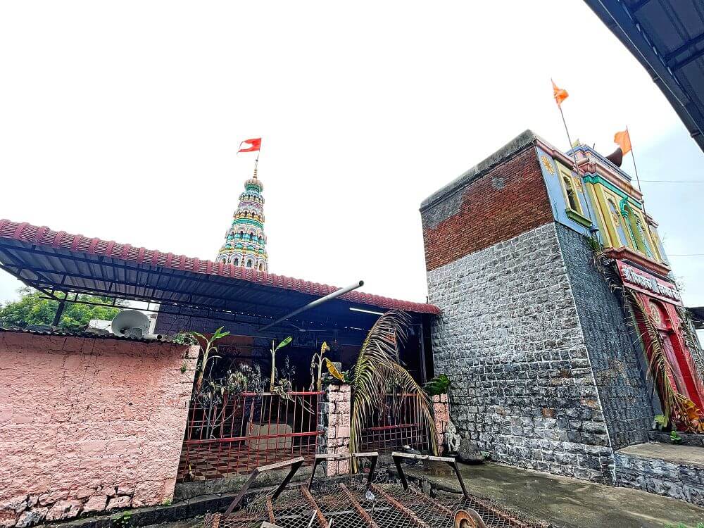 पूर्वी गावाबाहेर असलेले हे मंदिर आता वस्ती वाढल्याने गावाच्या मध्यवर्ती ठिकाणी आलेले आहे. मंदिरास भक्कम आवारभिंत आहे. या भिंतीत मंदिराचे दुमजली प्रवेशद्वार आहे. रस्त्यापेक्षा उंचावर असल्यामुळे प्रवेशद्वारास पाच पायऱ्या आहेत. पाचव्या पायरीवर कासव शिल्प आहे. पायरीमार्गाच्या दोन्ही बाजूला चौथरे आहेत. प्रवेशद्वाराच्या द्वारशाखांवर उभ्या धारेची नक्षी आणि मंडारकावर व ललाटबिंबावर कीर्तिमुख आहे. प्रवेशद्वारास नक्षीदार लाकडी झडपा व आतील दोन्ही बाजूला पहारेकरी कक्ष आहेत.