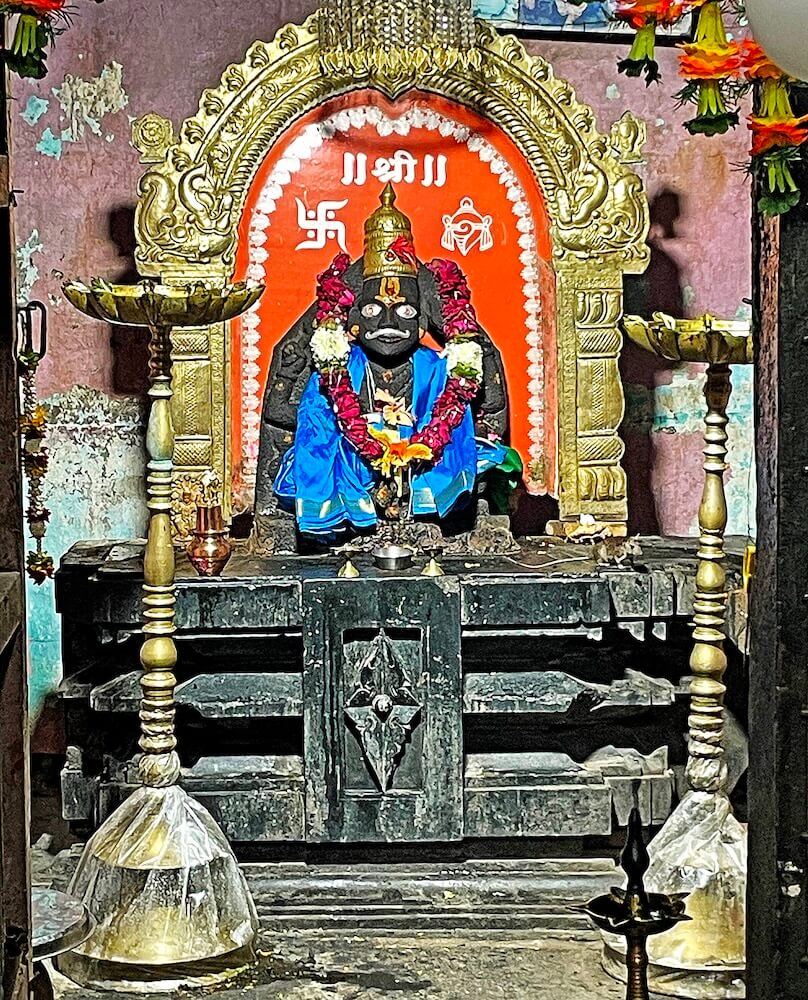 पुढे अंतराळाचे प्रवेशद्वार आहे. प्रवेशद्वाराच्या द्वारशाखांवर पानाफुलांची नक्षी आहे. ललाटबिंबावर देवशिल्प आहे. स्तंभशाखांवर सज्जा व त्यावरील उत्तरांगावर शिखरशिल्पे आहेत. मंदारकास चंद्रशिळा आहे. येथील गर्भगृहाच्या प्रवेशद्वाराची रचनाही अंतराळाच्या प्रवेशद्वारासारखीच आहे. गर्भगृहात वज्रपीठावर नृसिंह देवाची पद्मासन मुद्रेतील चतुर्भुज मूर्ती आहे. मूर्तीच्या हातात शंख, चक्र, गदा व पद्म आहेत. मूर्तीस चांदीचे डोळे व मिशा लावलेल्या आहेत. डोक्यावर सोनेरी मुकुट आहे. मूर्तीच्या मागील प्रभावळीवर दोन्ही बाजूस स्तंभनक्षी आणि वरील बाजूला मकरतोरण आहे. तोरणावर शंख, चक्र, ध्वज व पद्म शिल्प आहेत. वज्रपीठ व मूर्ती काळ्या पाषाणात आहेत. वज्रपीठावर पुष्पनक्षी आहे. गर्भगृहात मागील भिंतीत चौकोनी व अरुंद खिडकीवजा द्वार आहे. त्या पलीकडील पोकळीवजा कक्षात देवाचे भक्त मायनदेव प्रभू यांची समाधी असल्याचे सांगितले जाते.