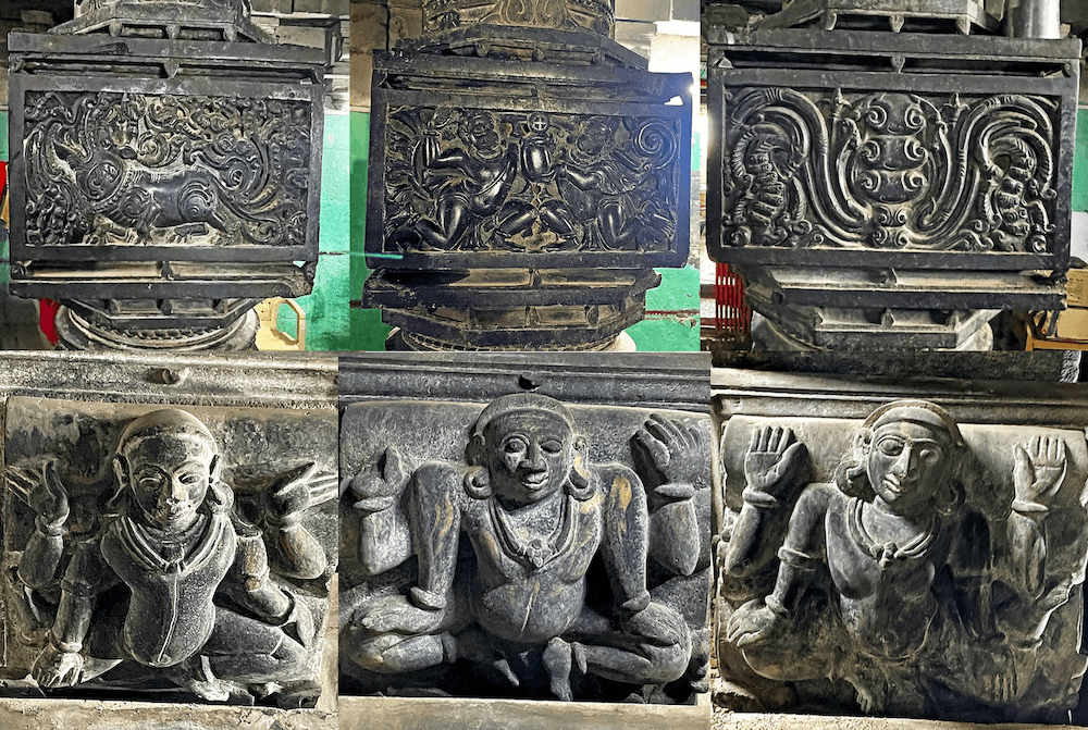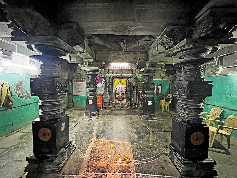 सभामंडपात प्रत्येकी चार नक्षीदार स्तंभांच्या चार रांगा आहेत. बाह्य बाजूचे स्तंभ भिंतीत आहेत. स्तंभपाद अधिक रुंद व चौकोनी आहेत. स्तंभदंडाचा खालील सुमारे तीन फूट भाग चौकोनी आहे. वरील भाग गोलाकार, षटकोन किंवा अष्टकोन अशा विविध भौमितिक आकारात आहे. स्तंभांवरील चौकोनी भागावर विविध नक्षी, कीर्तिमुख, मगरमुख, मयूरयुगल शिल्पे कोरलेली आहेत. स्तंभाच्या शीर्षभागी कणी व त्यावर हस्त आहेत. हस्तांवर तुळई व तुळईवर छत आहे. कणी, हस्त व तुळई नक्षीदार आहेत. हस्तांवर यक्षशिल्पे आहेत. त्यांनी वरील हातांनी छत तोलून धरले आहे, असे भासते. वितानावर चक्राकार नक्षी व मध्यभागी पाषाणी झुंबर आहे. सभामंडपात चार स्तंभांच्या मध्यभागी जमिनीवर काही इंच उंचीची गोलाकार रंगशिळा आहे. बंदिस्त स्वरूपाच्या सभामंडपात हवा येण्यासाठी गवाक्षे आहेत.