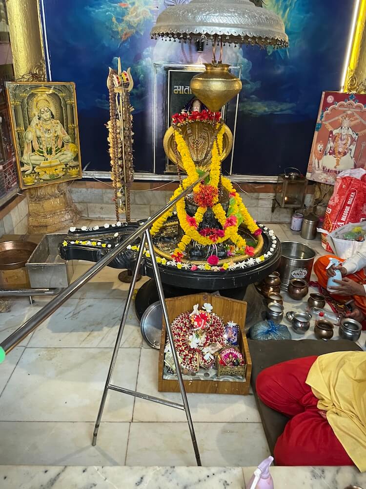 Inside the sanctum, at the heart of a grand, circular platform rests a majestic lingam carved from black marble. Above it, an intricately sculpted image of Jatadhari Shiva (Shiva with matted locks) wearing a serpent garland adorns the surface. A canopy formed by a coiled serpent shelters the lingam, while a bronze abhishek patra suspended from above ensures a continuous flow of water upon it. A silver umbrella crowns the top of the lingam, with a trident placed on its left side. In the niches on either side of the inner sanctum’s walls are the serene idols of Goddess Ganga on the left and Goddess Yamuna on the right. Behind the lingam, a niche houses the image of Goddess Parvati.