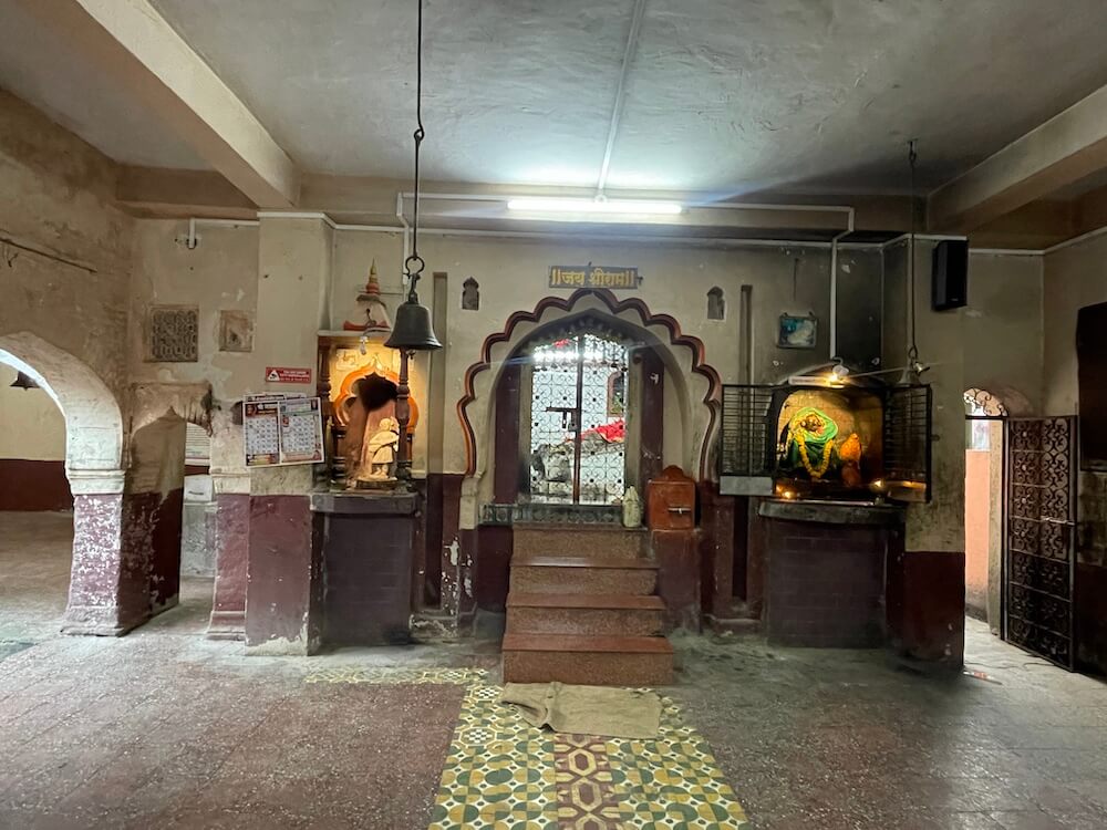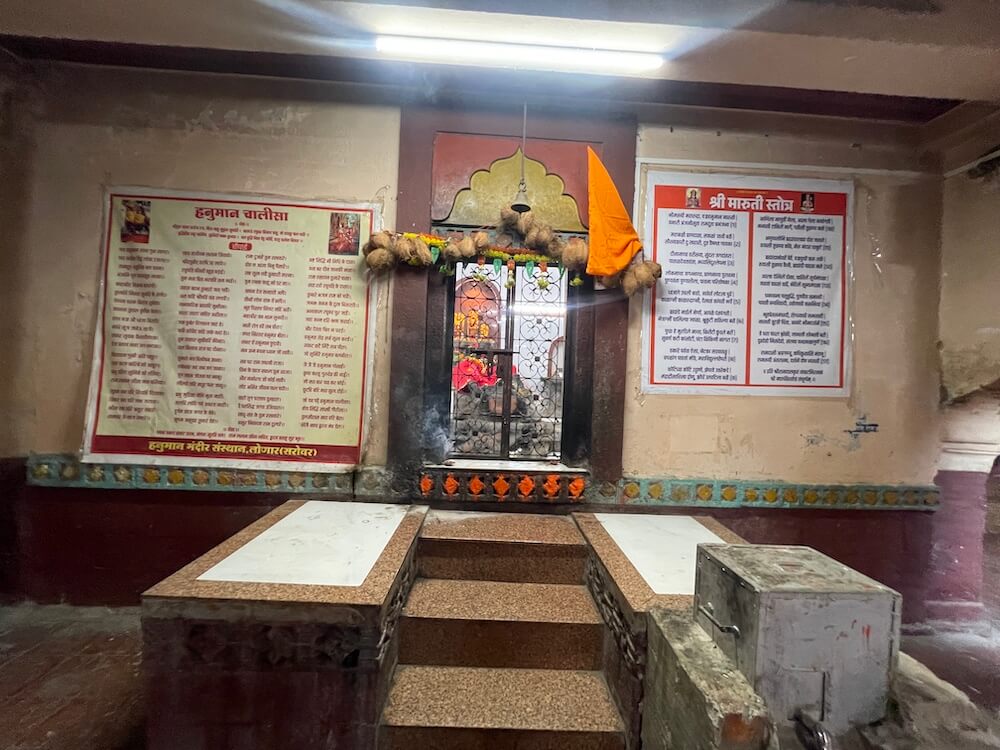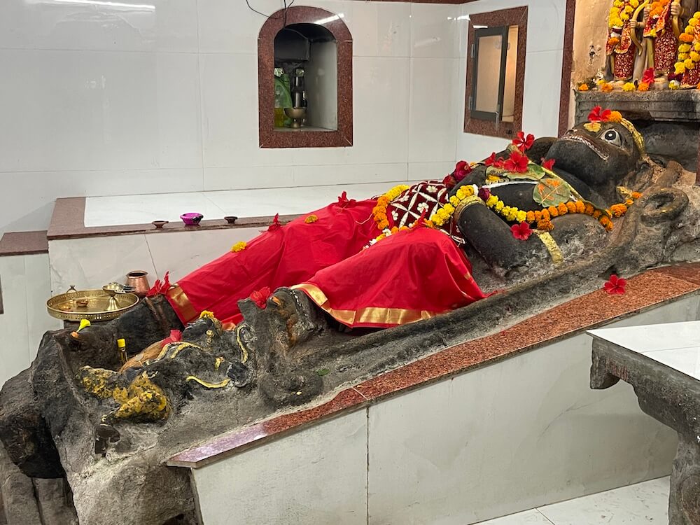 मुख्य गर्भगृहात निद्रिस्त हनुमानाची मूर्ती आहे. एकसंध पाषाणात घडवलेल्या या मूर्तीच्या मस्तकावर मुकुट असून त्यावर मुकुटमणी आहे. मूर्तीच्या कानात कुंडले आहेत. छातीवर रत्नजडित आभूषणे आहेत आणि उजवा हात वरदहस्त आहे. मूर्तीचा डावा हात छातीवर आहे. ध्यानमुद्रा व योगमुद्रा या मुद्रांचे एकत्रित रूप येथे पाहायला मिळते. या मूर्तीच्या कमरेला लंगोट आणि वस्त्रामध्ये सोगा आहे. पायात तोडे आणि एका पायात वाळा आहे. या मूर्तीच्या डाव्या पायाखाली शनिदेव मारुतीच्या शेपटीने जखडलेल्या अवस्थेत दिसतात. उजवीकडे शनिदेवांची पत्नी धामिनीदेवीची मूर्ती आहे.