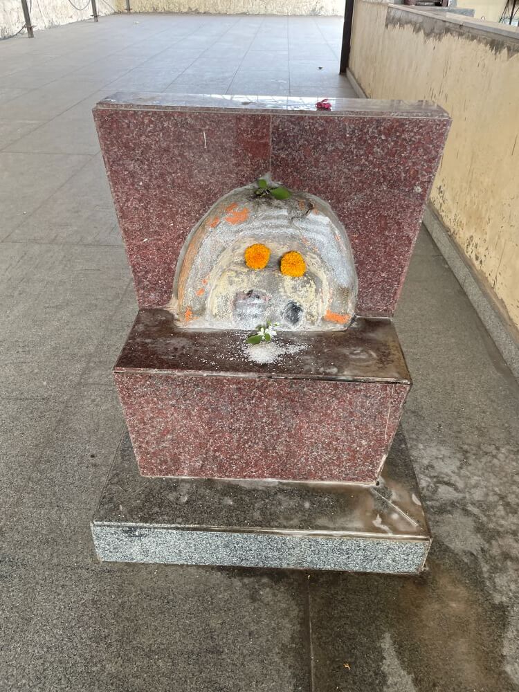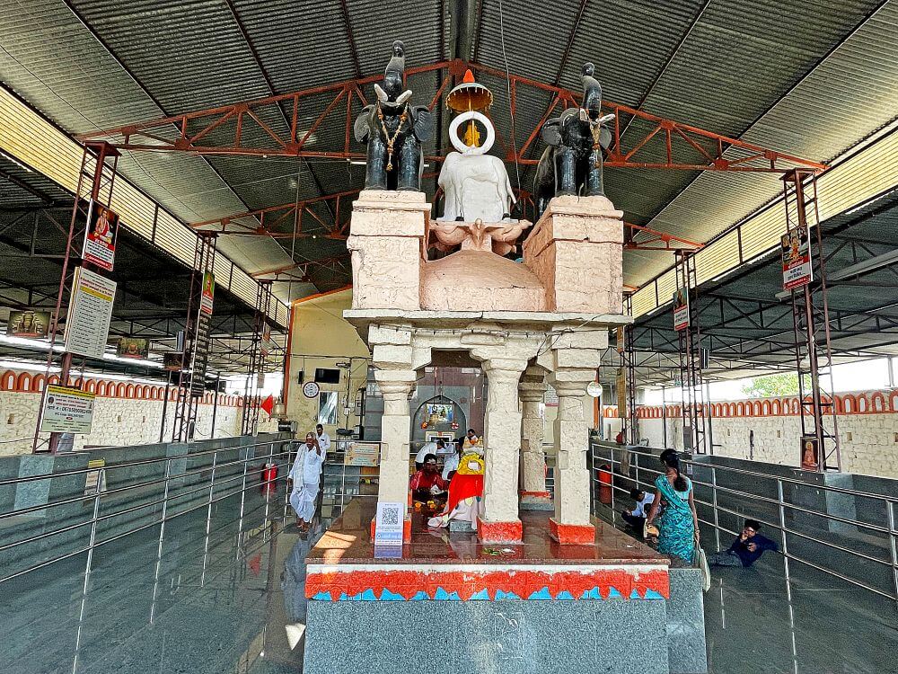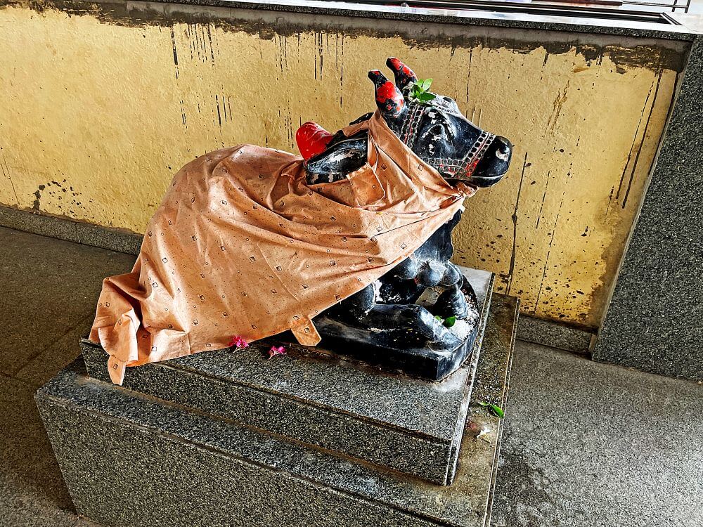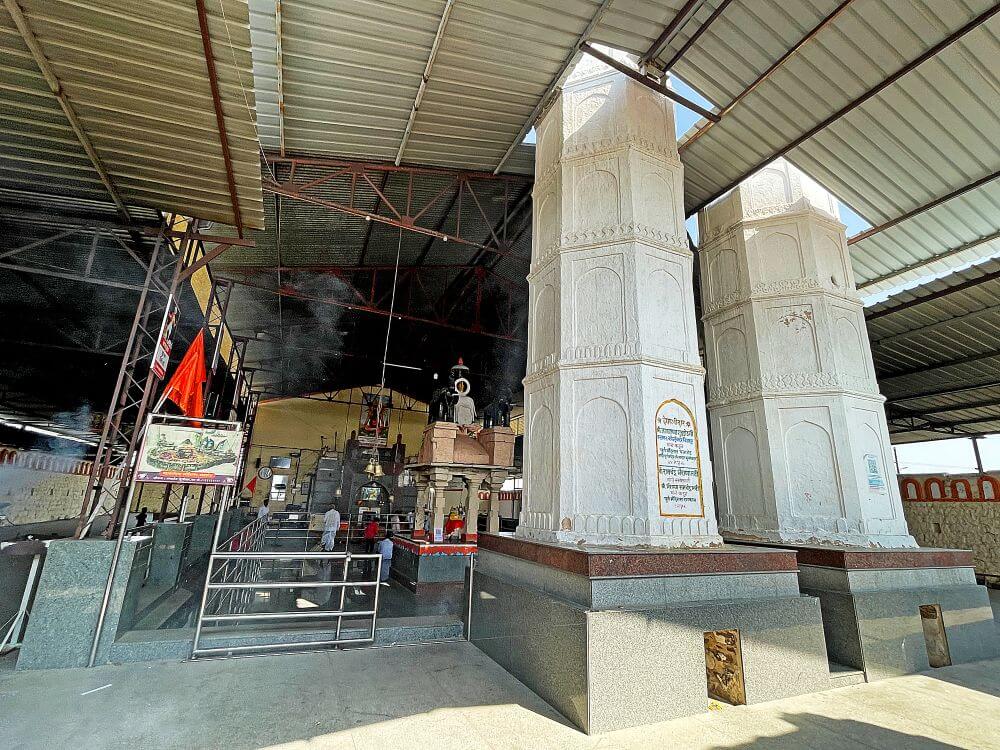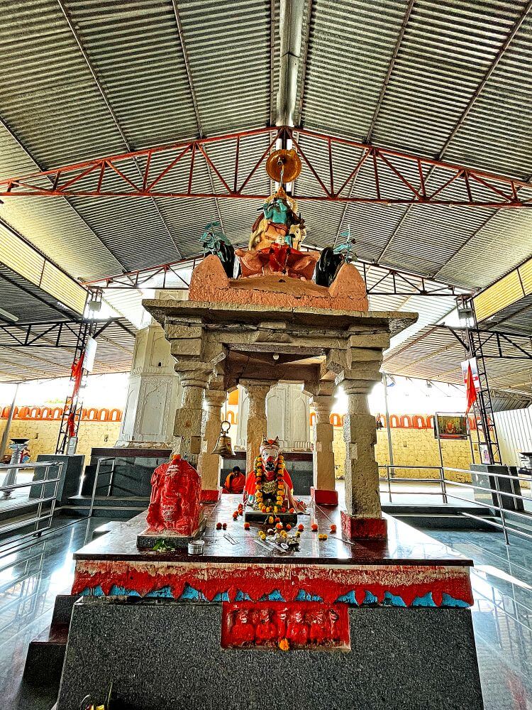 या प्रवेशद्वारातून आत आल्यावर मंदिराच्या प्रशस्त मंडपात प्रवेश होतो. या मंडपावर भाविकाच्या सोयीसाठी पत्र्याचे छत लावलेले आहे. मंडपात दोन चौथऱ्यांवर षट्कोनी अकराच्या दोन नक्षीदार दीपमाळा पत्र्याच्या छतातून वर गेलेल्या आहेत. दीपमाळांच्या पुढे नंदीमंडप आहे. चौथऱ्यावर उभ्या असलेल्या नंदीमंडपात नंदीची काळ्या पाषाणातील मूर्ती व सभोवती सहा नक्षीदार स्तंभ आहेत. स्तंभपादावर उभ्या स्तंभांच्या शीर्षभागी कणी, त्यावर हस्त व हस्तांवरील तुळईवर छत आहे. छतावर समोरील बाजूला दोन गजराज शिल्पे आहेत. मध्यभागी श्रीकृष्णाची मूर्ती आहे. नंदीमंडपात गणपतीची शेंदूरचर्चित मूर्ती आहे. या मंडपात भाविकांच्या गर्दीचे व्यवस्थापन करण्यासाठी दर्शनरांगेची व्यवस्था आहे.