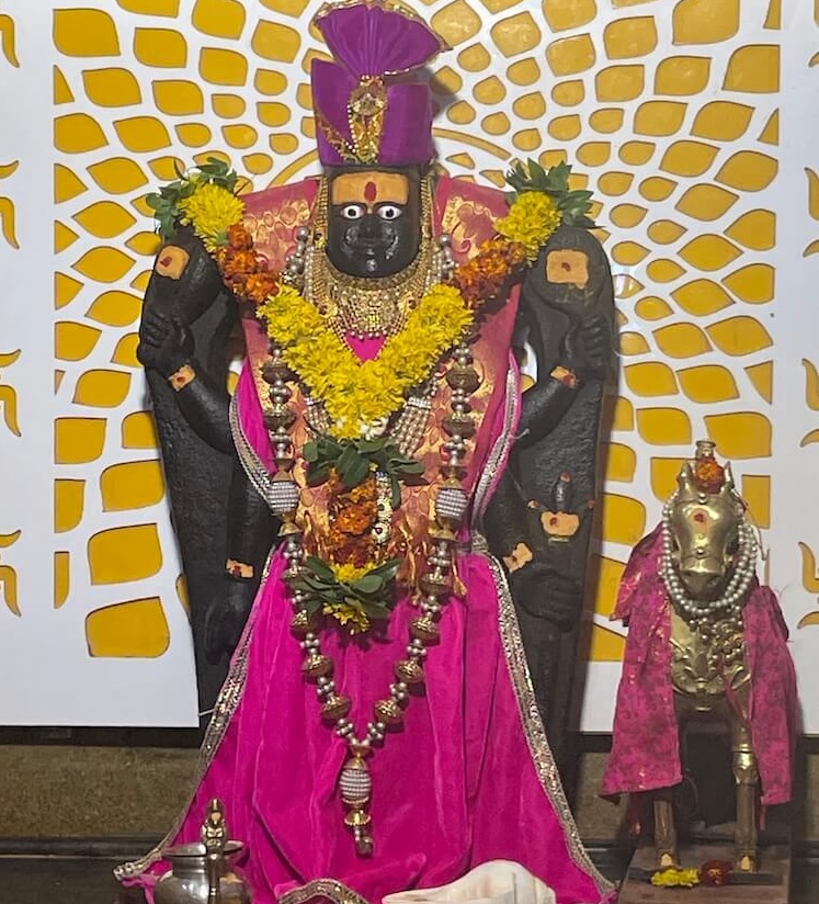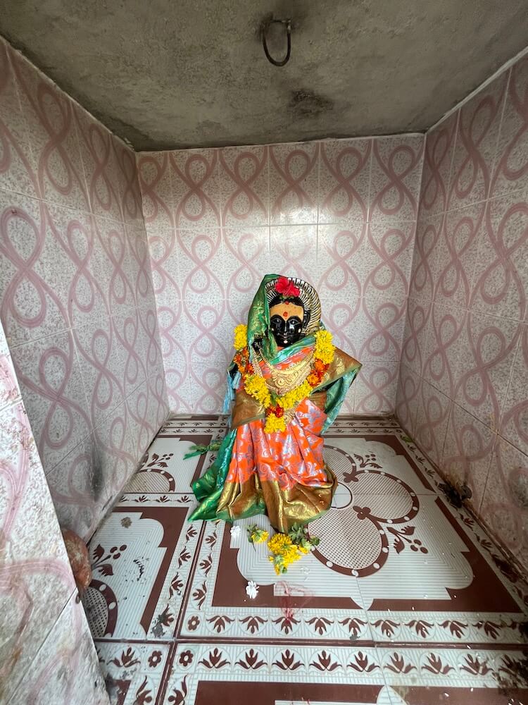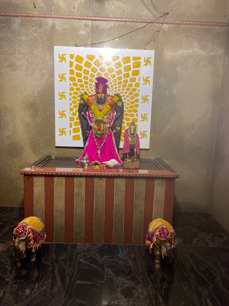 पुढे गर्भगृहाचे प्रवेशद्वार अंतराळापेक्षा उंचावर असल्यामुळे तिथेही दोन पायऱ्या आहेत. प्रवेशद्वाराच्या लाकडी द्वारशाखांवर पानाफुलांची नक्षी कोरलेली आहे आणि नक्षीदार लाकडी झडपा लावलेल्या आहेत.