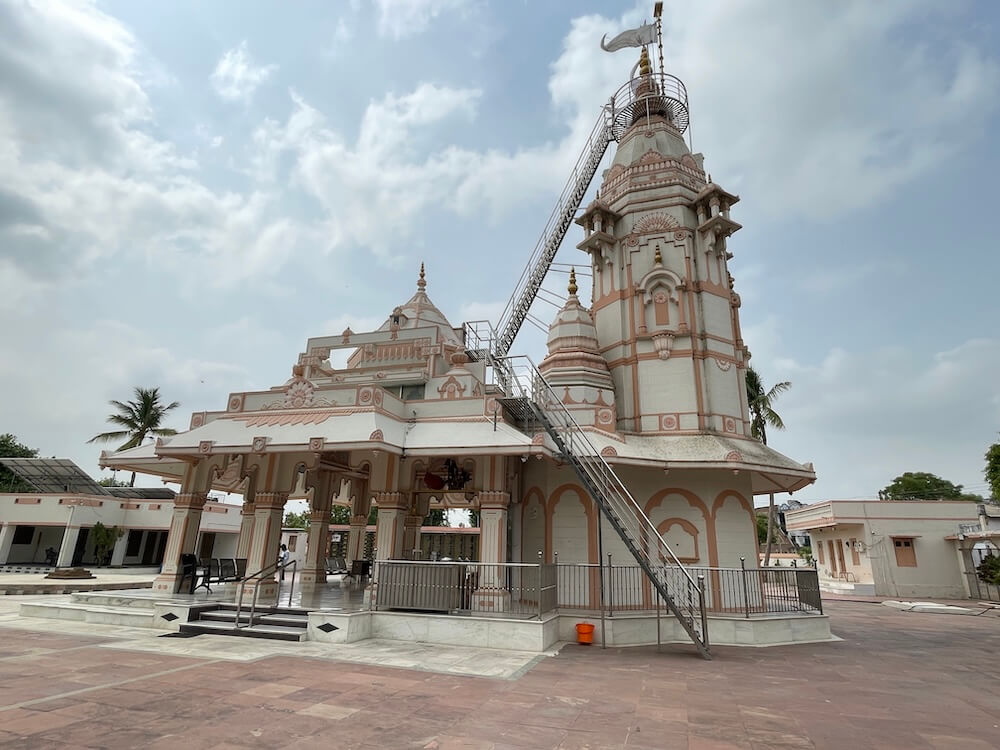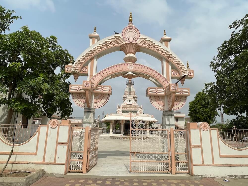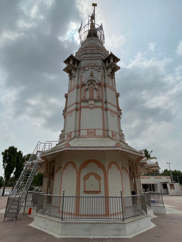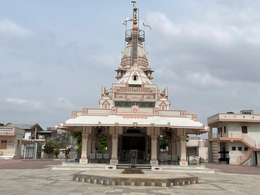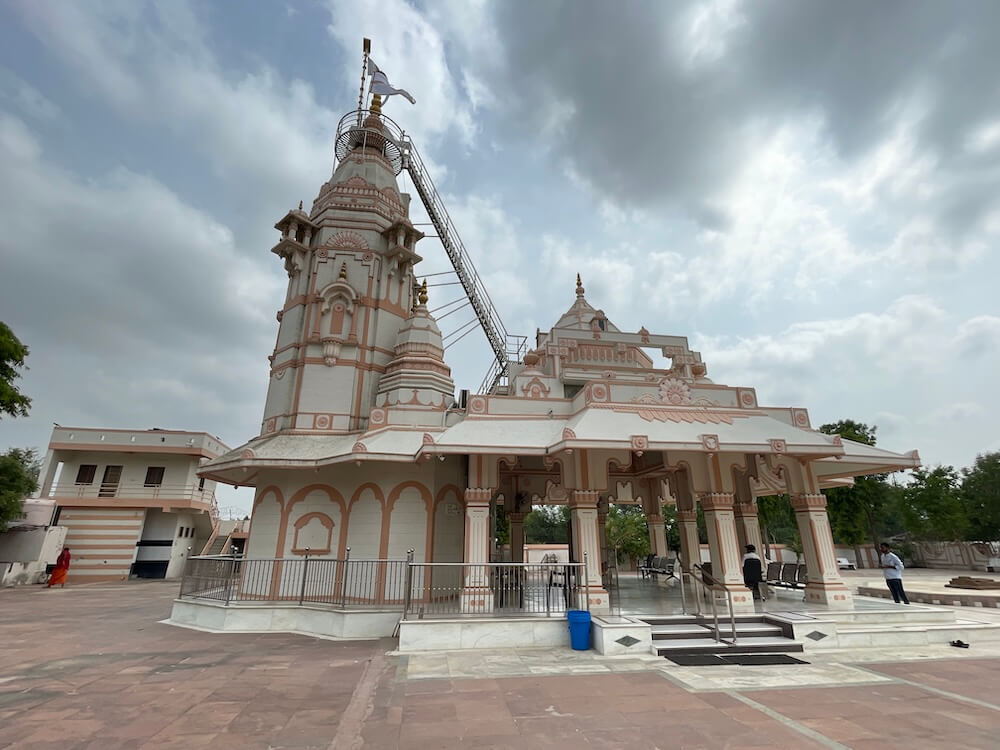 The sabha mandap is topped with a conical spire, while the sanctum sanctorum features a tall, tapering shikhara that narrows as it rises. At the base of this spire are four small domes. At its summit are a two-tiered amalaka and a four-tiered kalash. Temple flags wave proudly atop the shikhara.